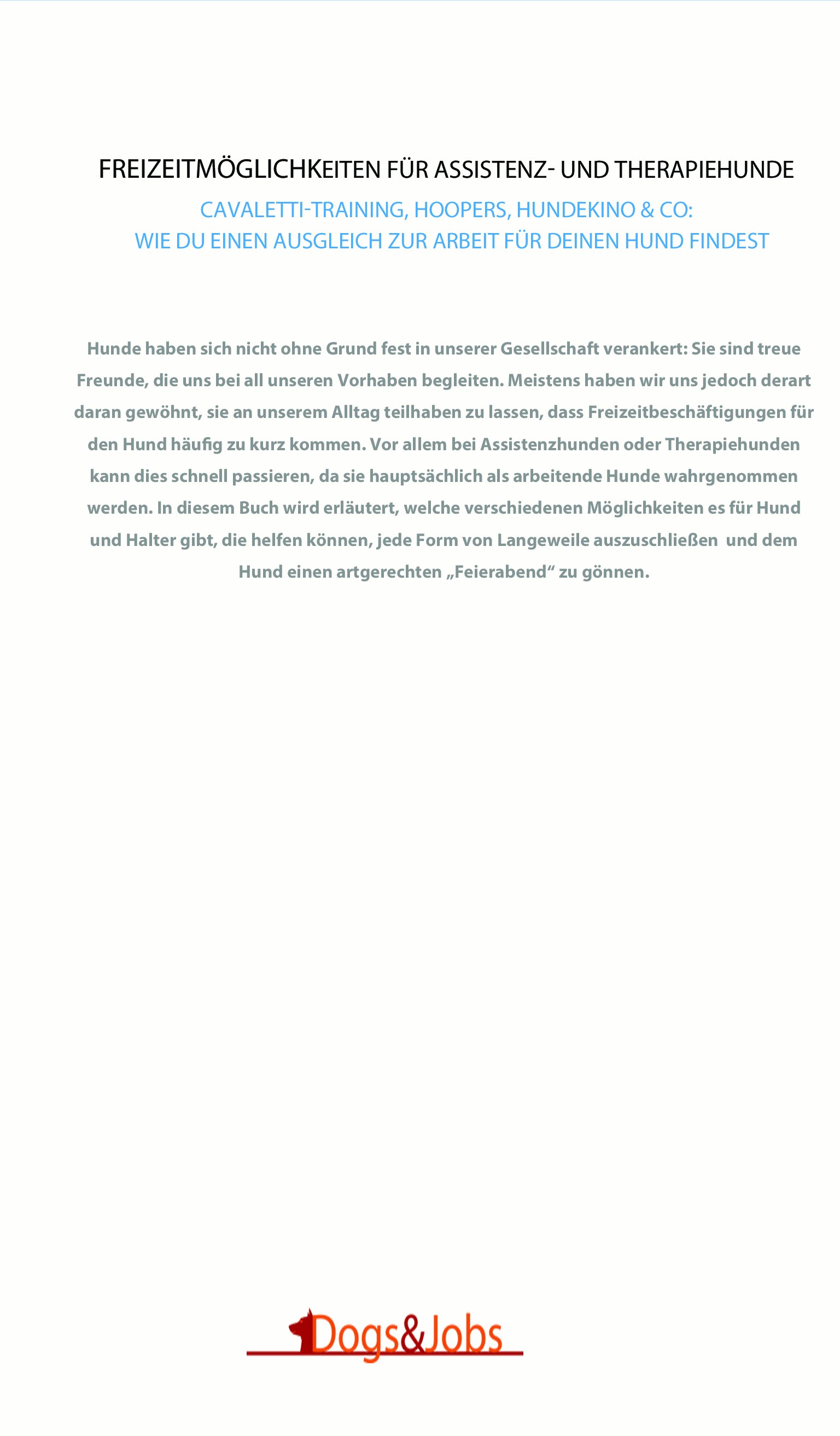 Hunde haben sich nicht ohne Grund fest in unserer Gesellschaft verankert: Sie sind treue Freunde, die uns bei all unseren Vorhaben begleiten. Meistens haben wir uns jedoch derart daran gewöhnt, sie an unserem Alltag teilhaben zu lassen, dass Freizeitbeschäftigungen für den Hund häufig zu kurz kommen. Vor allem bei Assistenzhunden oder Therapiehunden kann dies schnell passieren, da sie hauptsächlich als arbeitende Hunde wahrgenommen werden. In diesem Buch wird erläutert, welche verschiedenen Möglichkeiten es für Hund und Halter gibt, die helfen können, jede Form von Langeweile auszuschließen und dem Hund einen artgerechten „Feierabend“ zu gönnen.
