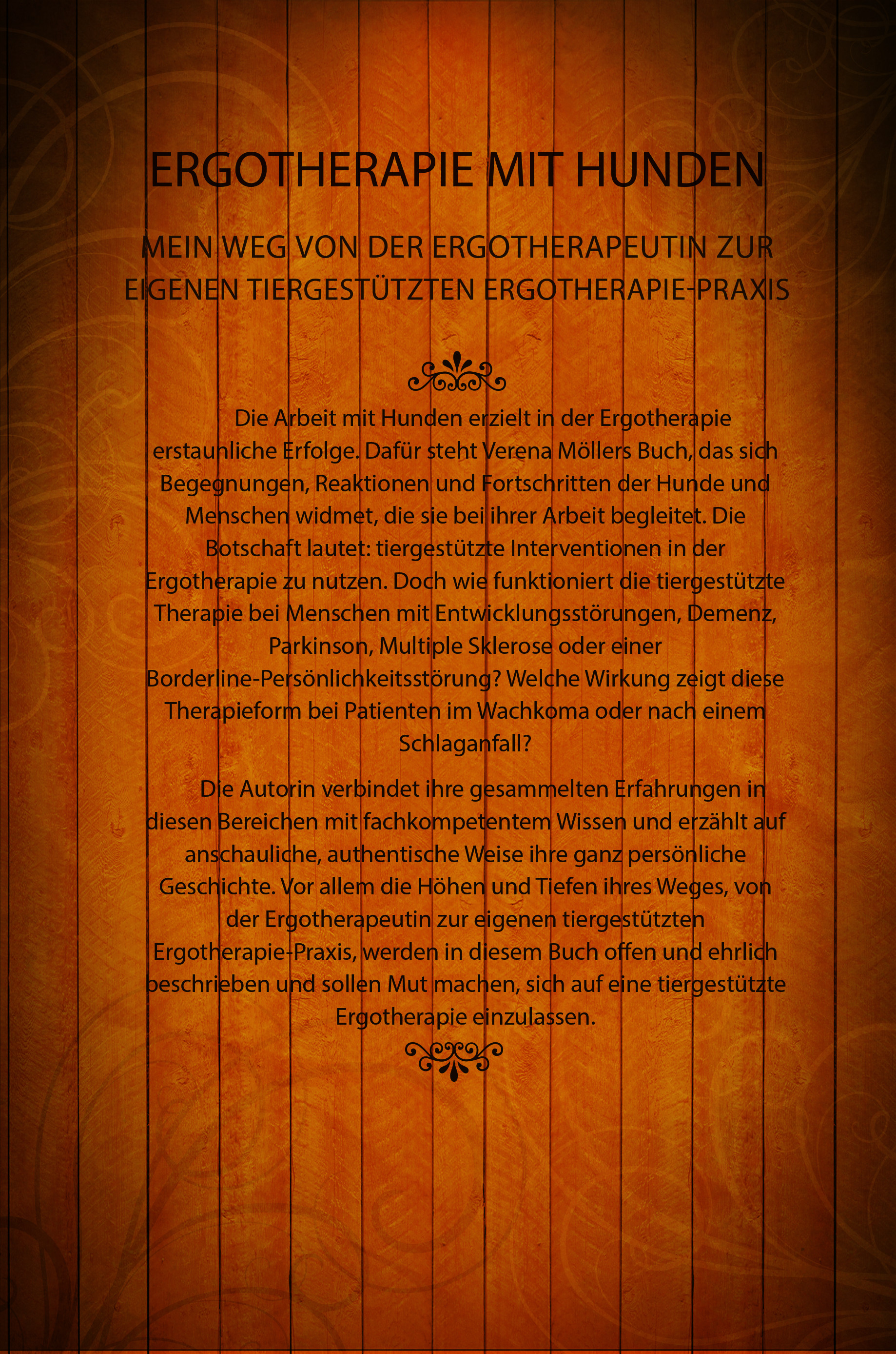 Verena Möller ist seit 2008 anerkannte Ergotherapeutin. Nach Tätigkeiten in einer Klinik für Orthopädie und psychosomatische Erkrankungen sowie in einer niedergelassenen Ergotherapiepraxis absolvierte sie 2012 erfolgreich die Weiterbildung zum Therapiebegleithundeteam und 2014 zur Fachkraft für tiergestützte Interventionen – beides nach ESAAT. 2013 gründete sie die Ergotherapiepraxis ErgoDog in Osnabrück, wo sie mit ihren Hunden lebt. Zusammen mit zwei Angestellten – Linda Neubert und Nicole Herzig – arbeitet das Team hoch motiviert und erfolgreich im Bereich der tiergestützten Ergotherapie. Der Puggle Nelson, die Hovawart-Appenzeller-Colli-Mix-Hündin Lotta (mittlerweile in Rente), der Retro-Mops Pepe, der Labrador Nero und die Border-Collie-Hündin Benitha vervollständigen das Team. 2015 besuchte sie Cesar Millan in Los Angeles im Dog Psychology Center und 2017 den renommierten Kynologen Günter Bloch in Nova Scotia, Kanada. Außerdem besitzt sie diverse Weiterbildungen im Bereich der Hundepsychologie.