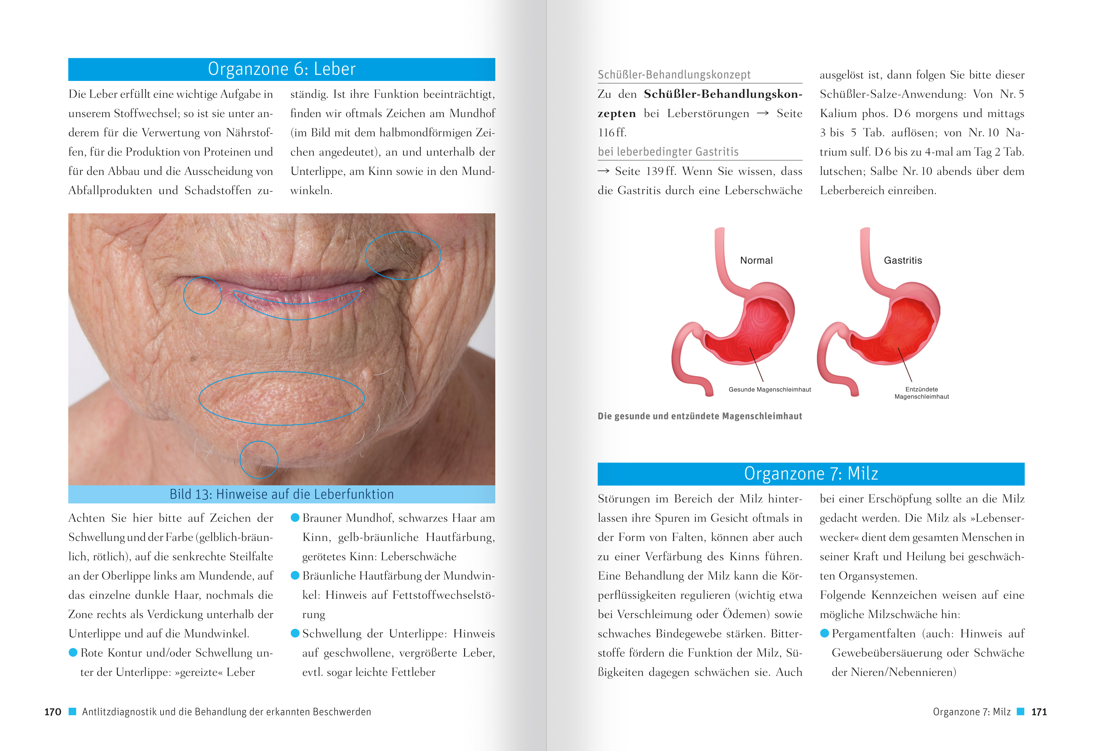 INHALTEinleitungWAS SIND EIGENTLICH SCHÜSSLER-SALZE?Der Beginn einer neuen ZeitDie Biochemie nach Dr. Wilhelm Heinrich SchüßlerEmpfehlungen zur EinnahmeDie 12 Schüßler-Salze und ihre Bedeutung für den Körper- Nr. 1 Calcium fluoratum- Nr. 2 Calcium phosphoricum- Nr. 3 Ferrum phosphoricum- Nr. 4 Kalium chloratum- Nr. 5 Kalium phosphoricum- Nr. 6 Kalium sulfuricum- Nr. 7 Magnesium phosphoricum- Nr. 8 Natrium chloratum- Nr. 9 Natrium phosphoricum- Nr. 10 Natrium sulfuricum- Nr. 11 Silicea (SiO2 - H2O)- Nr. 12 Calcium sulfuricum (CaSO4 2 H2O)Die biochemischen ErgänzungsmittelDie 12 biochemischen SalbenHANDDIAGNOSTIK UND DIE BEHANDLUNG DER ERKANNTEN BESCHWERDENDiagnostik anhand der Fingernägel - Das Nagelbild und seine Deutung- 1: Weißfärbung bis Milchglasnägel- 2: Leukonychie - wolkenartige Pigmentierung- 3: "Half-and-half-nails"- 4: Schneeweißer Nagelübertritt- 5: Weißer Längsstreifen (Verhornungsstörung)- 6: Dunkler Saum um Nagelmond- 7: Körner-, Fingerhutnägel (körnige, punktartige Substanzdefekte)- 8: Weiße Querstreifen- 9: Erythem/Splitterblutung- 10: Gitterrillenbildung- 11: Längsrillenbildung bis Perlrillenbildung- 12: Querrillenbildung (Beau-Linien)- 13: SpaltnägelDiagnostik über die Handinnenfläche - Die sogenannte Chirologie- A: Säbelartige Biegung des Kleinfingers- B: Abknickung Nagelglied Kleinfinger zu Ringfinger- C: Tailliertes Mittelglied Ringfinger- D: Abknickung Ringfingernagelglied zum Mittelfinger- E: Verdickung zw. Grund- und Mittelglied Mittelfinger- F: Abknickung Mittelfingernagelglied zu Ringfinger- G: Abknickung Zeigefingernagelglied zu Mittelfinger- H: Tailliertes Mittelfingergrundgelenk- I: Taillierter Daumen- 1: Andreas-Kreuz zwischen Lebens- und Kopflinie- 2: Raute auf Zeigefingerberg- 3: Tannenreisigform am Zeigefingeransatz- 4: Senkrechter Strich auf Schwimmhaut zwischen Zeige- und Mittelfinger- 5: Mehrfach gestrichelter Venusring- 6: Deltaartiges Ende der Herzlinie- 7: Sich stark zueinander neigende Kopf- und Herzlinie- 8: Auf Herzlinie fallende Schlängellinie aus Schwimmhaut bzw. Klein- u. Ringfinger- 9: Tannenreisig am Kleinfingeransatz- 10: Ellipse unter Kleinfinger (auch zwischen Klein- und Ringfinger)- 11: Zerstückelte, zerrissene Merkurlinie- 12: Mehrfachstrichelung auf Mondberg- 13: Im Mondberg abfallende Kopflinie- 14: Vielfache Aufwärtsstrichelung auf Uranus-/Mondberg- 15: Sich aufwärtswölbende Raszette- 16: Unruhig gezeichneter DaumenansatzANTLITZDIAGNOSTIK UND DIE BEHANDLUNG DER ERKANNTEN BESCHWERDENDas Gesicht des Menschen - Antlitzzeichen verstehen lernenOrganzonen im Gesicht- Organzone 1: Magen- Organzone 2: Dünndarm- Organzone 3: Dickdarm- Organzone 4: Gallenblase- Organzone 5: Galle ableitender Gang- Organzone 6: Leber- Organzone 7: Milz- Organzone 8: Bauchspeicheldrüse- Organzone 9: Lunge/Bronchien- Organzone 10: Lungenkreislauf- Organzone 11: Herz- Organzone 12: Sonnengeflecht- Organzone 13: Schilddrüse- Organzone 14: Stoffwechselareale- Organzone 15: Nieren- Organzone 16: Gebärmutter/Prostata- Organzone 17: Harnblase- Organzone 18: Nervenkraft- Organzone 19: Eierstock/Eileiter bzw. Hoden/SamenleiterANHANGAnwendungsempfehlungen- Ansteigendes Fußbad- Basische Bäder (= Entschlackungsbäder)- Bindegewebsmassage- Schröpfkopfmassage- Leberwickel- Meridianausgleichsübungen- Meridianbürstenmassage- Nasenreflexzonenbehandlung- Schilddrüsenwickel- OrganuhrDanksagungQuellenangabenRegister