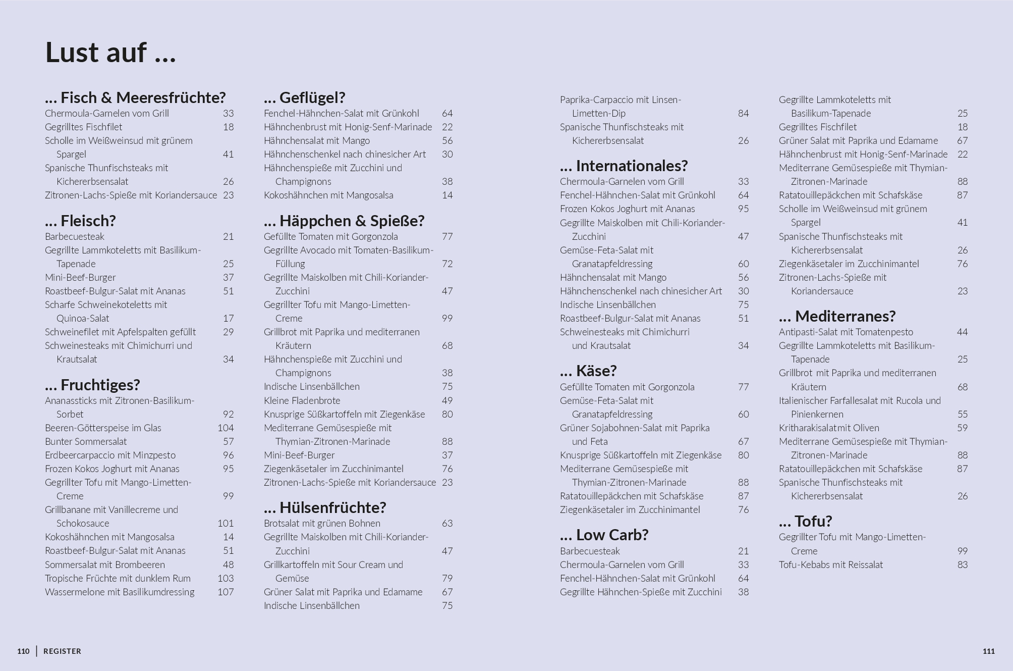 Ausführliches Register, mit dem Sie ganz leicht ein abwechslungsreiches Grill-Buffet zusammenstellen können