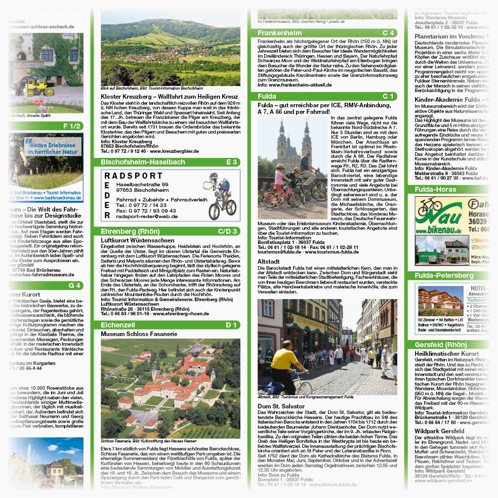 Die Mittelgebirgslandschaft der Rhön wird geprägt von sanft gerundeten Bergkegeln, weiten blumenübersäten Matten und Wiesen sowie urtümlichen Mooren. Über zahlreiche längere und kürzere Radwege lassen sich Natur, Kulturschätze und Sehenswürdigkeiten entdecken. Wer Steigungen nicht scheut, der genießt die Aussicht von der Wasserkuppe oder vom Milseburg. Verdiente Erholung bieten die Kurorte wie Bad Kissingen, Bad Bocklet oder Bad Brückenau während die Museen, Schlösser und Burgen zwischen Fulda, Wasungen und Münnerstadt zu kulturellen Erlebnissen einladen.
