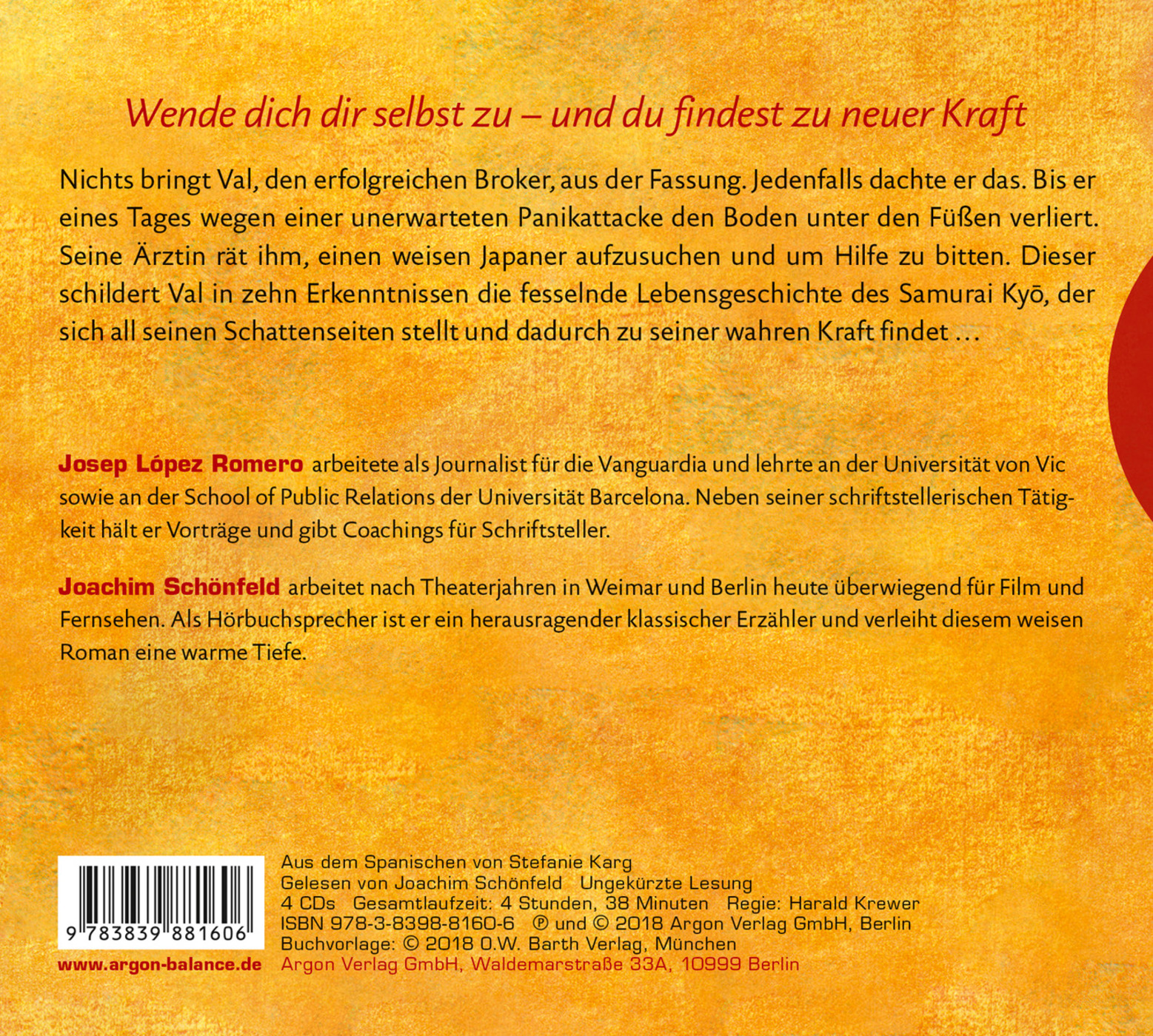 Nichts bringt Val, den erfolgreichen Broker, aus der Fassung. Jedenfalls dachte er das. Bis er eines Tages wegen einer unerwarteten Panikattacke den Boden unter den Füßen verliert. Seine Ärztin rät ihm, einen weisen Japaner aufzusuchen und dort um Hilfe zu bitten. Dieser schildert Val in zehn Erkenntnissen die fesselnde Lebensgeschichte des Samurai Kyo, der sich all seinen Schattenseiten stellt und dadurch zu seiner wahren Kraft findet. Josep López Romero bringt uns auf wunderbare Weise zehn Lebensweisheiten näher, die ein befreites Leben ohne Angst ermöglichen.