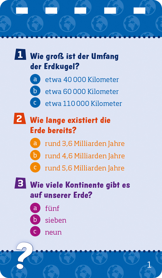 | Schlagworte | Erde • Flüsse • Frage-Antwort-Spiel • Gebirge • Geografie • Geschichte • Klima-Wandel • Kontinente • Meere • Natur • Planeten • Quiz-Block • Rätsel • Tiere • Tsunami • Universum • Weltall • Wissen |