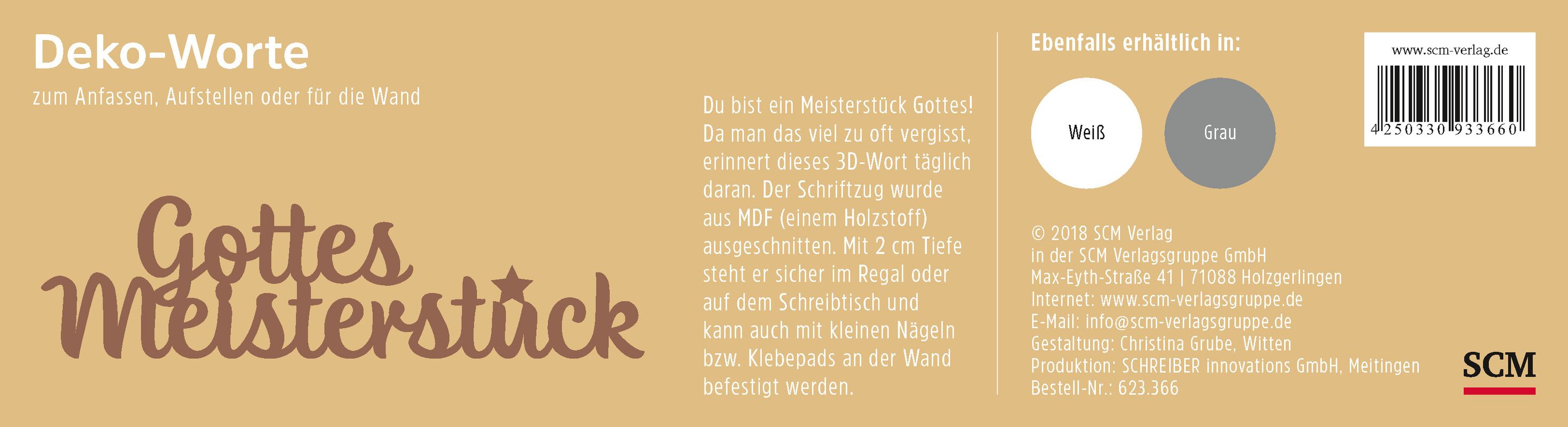 Du bist ein Meisterstück Gottes! Da man das viel zu oft vergisst, erinnert dieses 3D-Wort täglich daran. Der Schriftzug wurde aus MDF (einem Holzstoff) ausgeschnitten und in Kupfer lackiert. Mit 2 cm Tiefe steht er perfekt im Regal oder auf dem Schreibtisch und kann auch mit kleinen Nägeln bzw. Klebepads an der Wand befestigt werden. Das Dekowort wird in einer attraktiven Klarsichtbox verschickt.