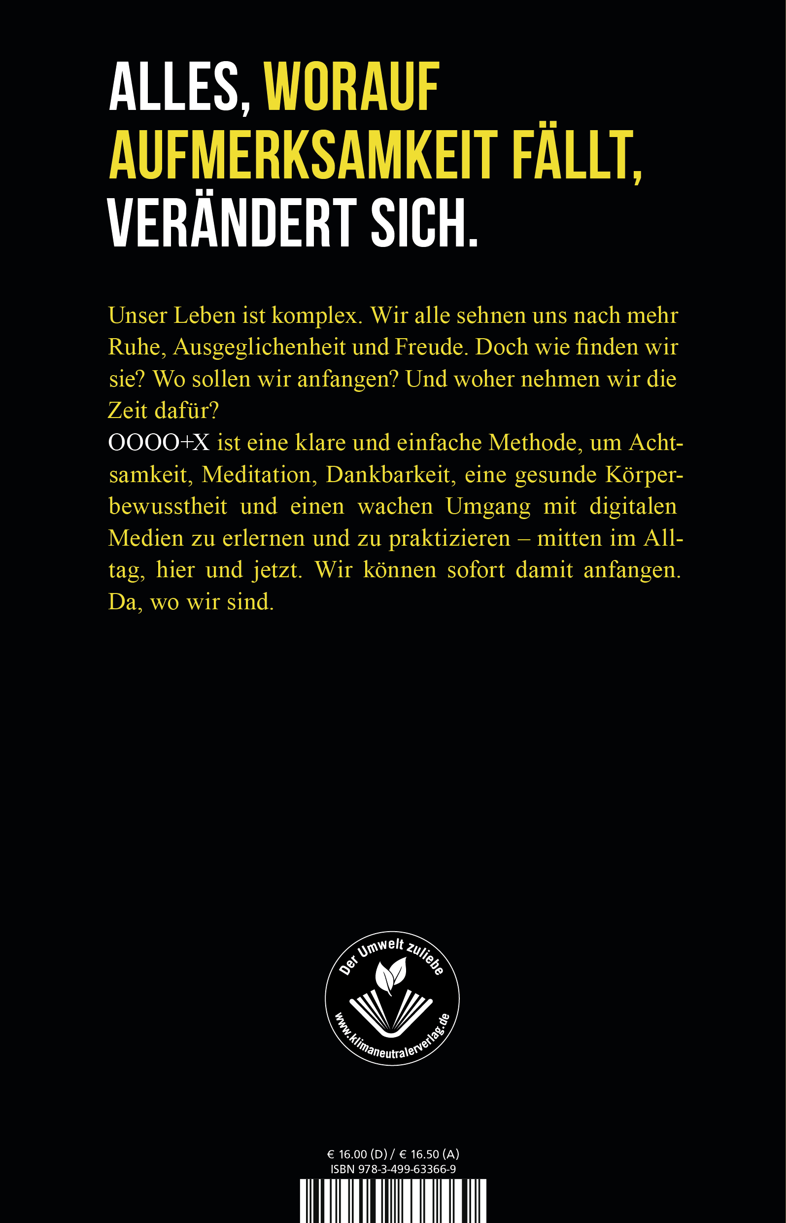 Auch er hat sich eine Pause von seinem Leben als Musiker nehmen müssen, um sich neu zu verorten und herauszufinden, welche Dinge für ihn zu einem guten Leben gehören und welche lieber aussortiert werden sollten. In dieser Zeit hat er nicht nur die Liebe zum Rap wiederentdeckt, sondern auch die positive Wirkung von Meditation, Achtsamkeit, Digital Detox und Körperbewusstsein. Die Essenz seiner Erfahrungen hat er in der OOOO+X-Methode zusammengefasst - bestechend und klar, ganz ohne Räucherstäbchen, Mantras und Weltmusik.