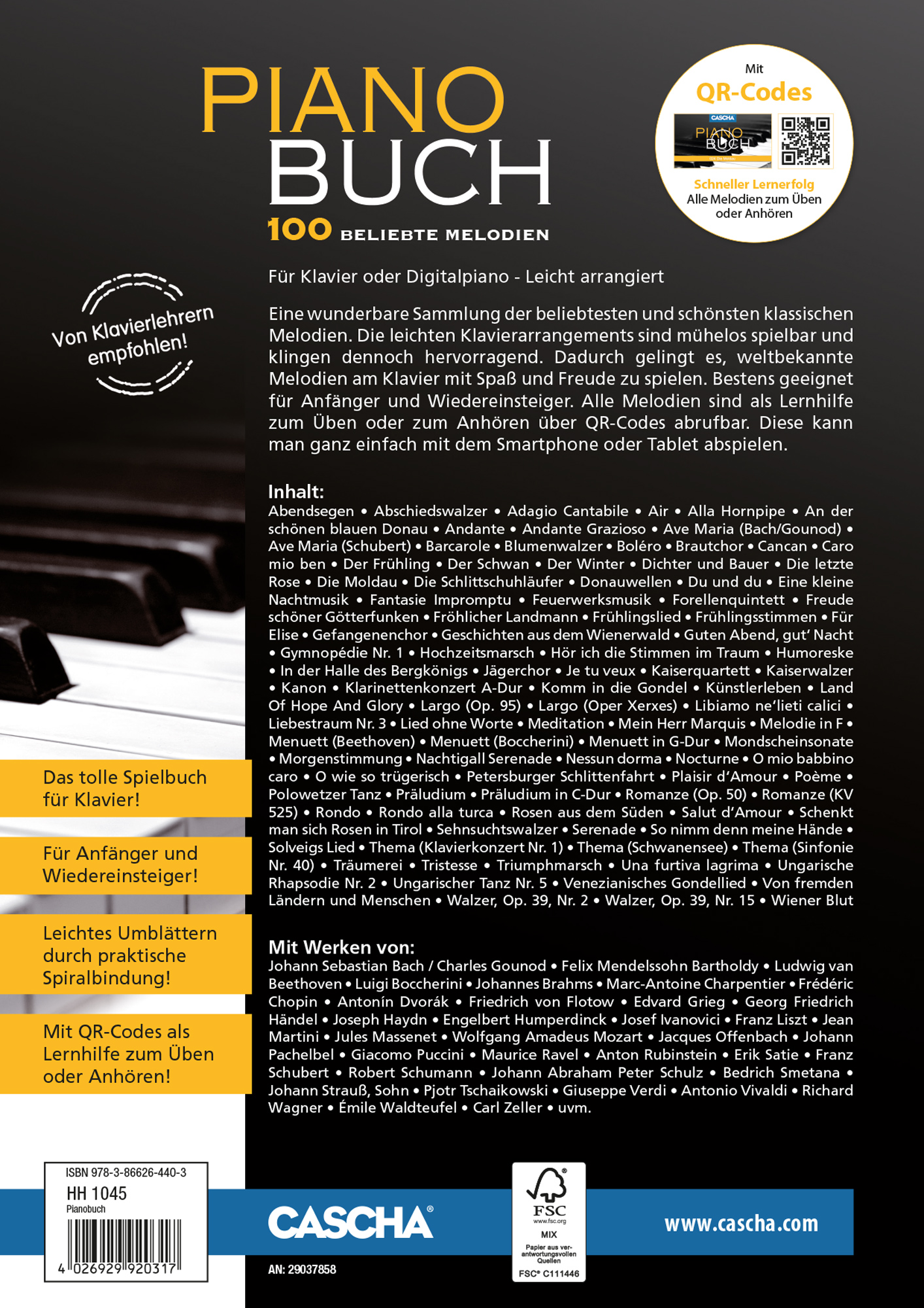 Eine wunderbare Sammlung der 100 beliebtesten und schönsten klassischen Melodien. Die leichten Klavierarrangements sind mühelos spielbar und klingen dennoch hervorragend. Dadurch gelingt es, weltbekannte Melodien am Klavier mit Spaß und Freude zu spielen. Bestens geeignet für Anfänger und Wiedereinsteiger. Alle Melodien sind als Lernhilfe zum Üben oder zum Anhören auf den 2 beiliegenden CDs enthalten. Durch die praktische Spiralbindung bleibt das Buch offen liegen und kann ganz leicht umgeblättert werden.