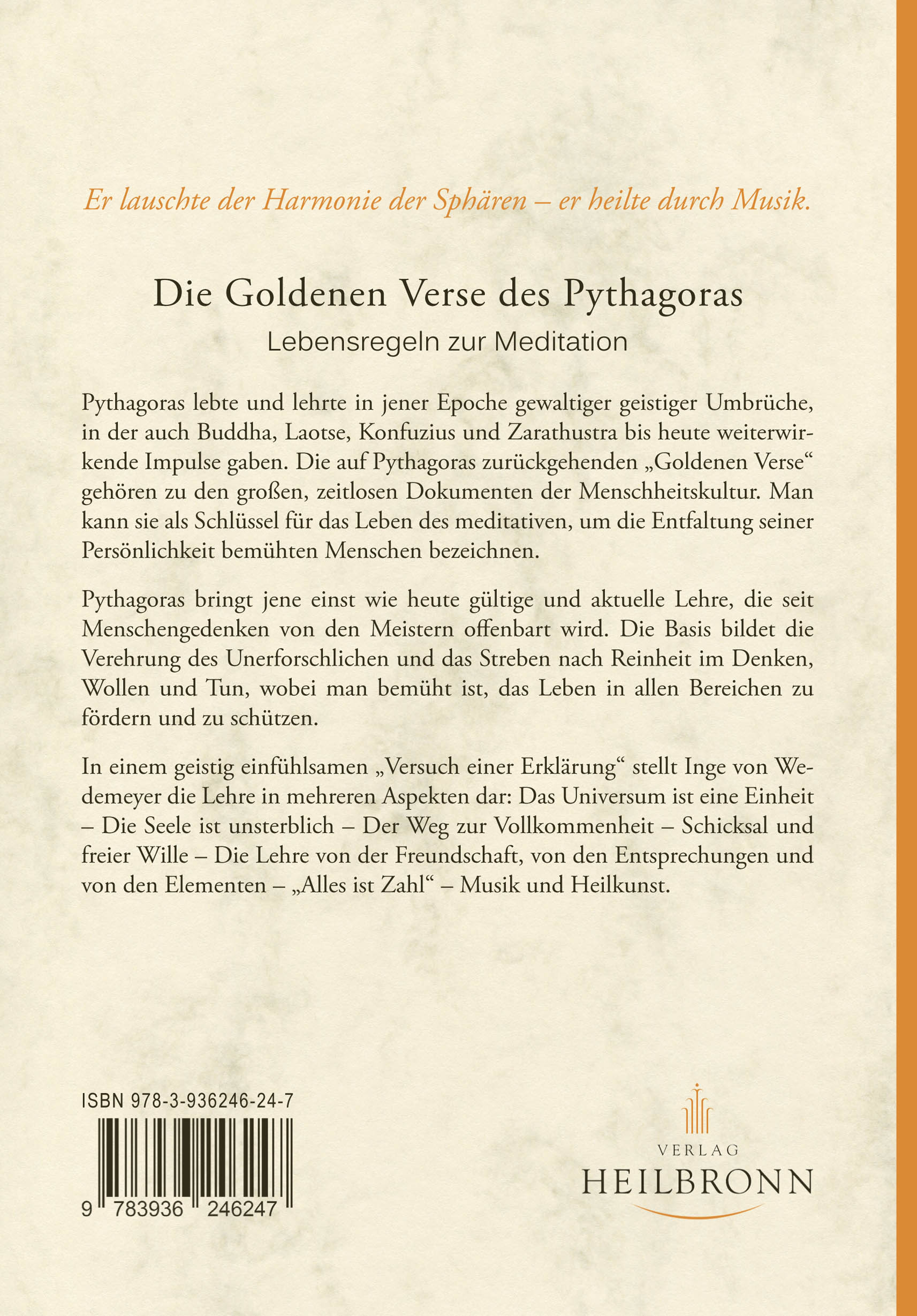 Auszug aus dem Vorwort von Inge von WedemeyerPythagoras - Mythos und Wirklichkeit aus fernen Tagen! Was aber hat der große Lehrmeister der Griechen, ja des Abendlandes dem heutigen Menschen zu sagen? Bei Pythagoras bildeten Religion, Leben und Wissenschaft eine Einheit. Zu den Erkenntnissen und Erfahrungen der von ihm übermittelten und entwickelten Wissenschaften aber wird man nur insoweit Zugang finden, als man - so lehren es alle großen Meister - Ehrfurcht vor dem Unerforschlichen hat und eine lautere Lebensführung anstrebt, bemüht, das Leben in allen Bereichen zu fördern und zu schützen. Daher sind seine Lebensregeln der Erziehung und Selbsterziehung des Pythagoras die Basis seiner Lehren und finden in den "Goldenen Versen" ihren einst wie heute gültigen Ausdruck.Die "Goldenen Verse" gehören zu den großen, zeitlosen Dokumenten der Menschheitskultur, und man kann sie als Schlüssel für den geistigen Pfad, für das Leben des meditativen Menschen, bezeichnen, - jenen "Pfad", wie ihn die Meister seit Menschengedenken ihre Schüler lehren, nicht zuletzt, indem sie selber ihn vorleben.