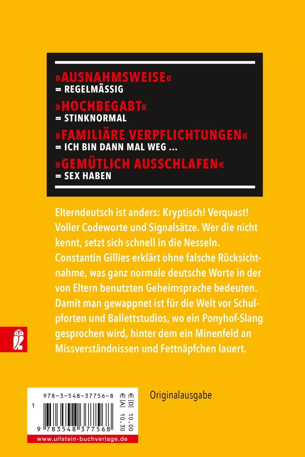 Das Deutsch moderner Mütter und Väter ist anders: Kryptisch! Verquast! Voller Codeworte und Signalsätze. Wer die nicht kennt, setzt sich schnell in die Nesseln. Von "Ausnahmweise" (immer) über "hochbegabt" (stinknormal) bis "Ziehdasjetzan!" (Ich dreh gleich durch...) erklärt Constantin Gillies ohne falsche Rücksichtnahme, was ganz normale Worte in der von Eltern benutzen Geheimsprache bedeuten. Damit man gewappnet ist, wenn man sich in die Welt der Spielplätze, Schulpforten und Ballettstudios begibt, wo Eltern und die Früchte ihrer Lenden das Sagen haben und unterhalb des Ponyhof-Slangs ein Minenfeld an Missverständnissen und Fettnäpfchen lauert.