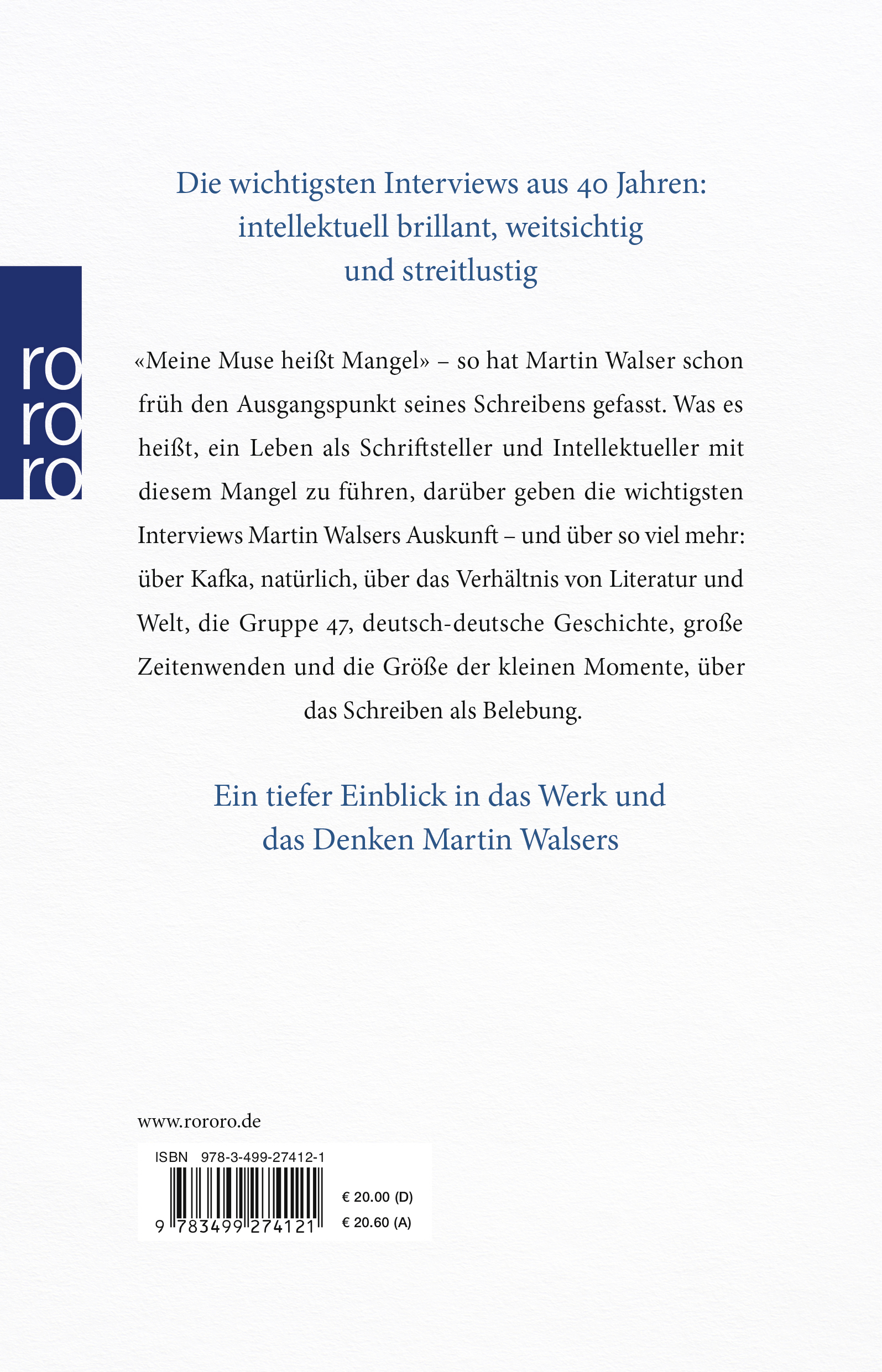 «Meine Muse heißt Mangel» - so hat Martin Walser schon früh den Ausgangspunkt seines Schreibens gefasst. Was es heißt, ein Leben als Schriftsteller und Intellektueller mit diesem Mangel zu führen, darüber geben die wichtigsten Interviews Martin Walsers Auskunft - und über so viel mehr: über Kafka, natürlich, über das Verhältnis von Literatur und Welt, die Gruppe 47, deutsch-deutsche Geschichte, große Zeitenwenden und die Größe der kleinen Momente, über das Schreiben als Belebung.