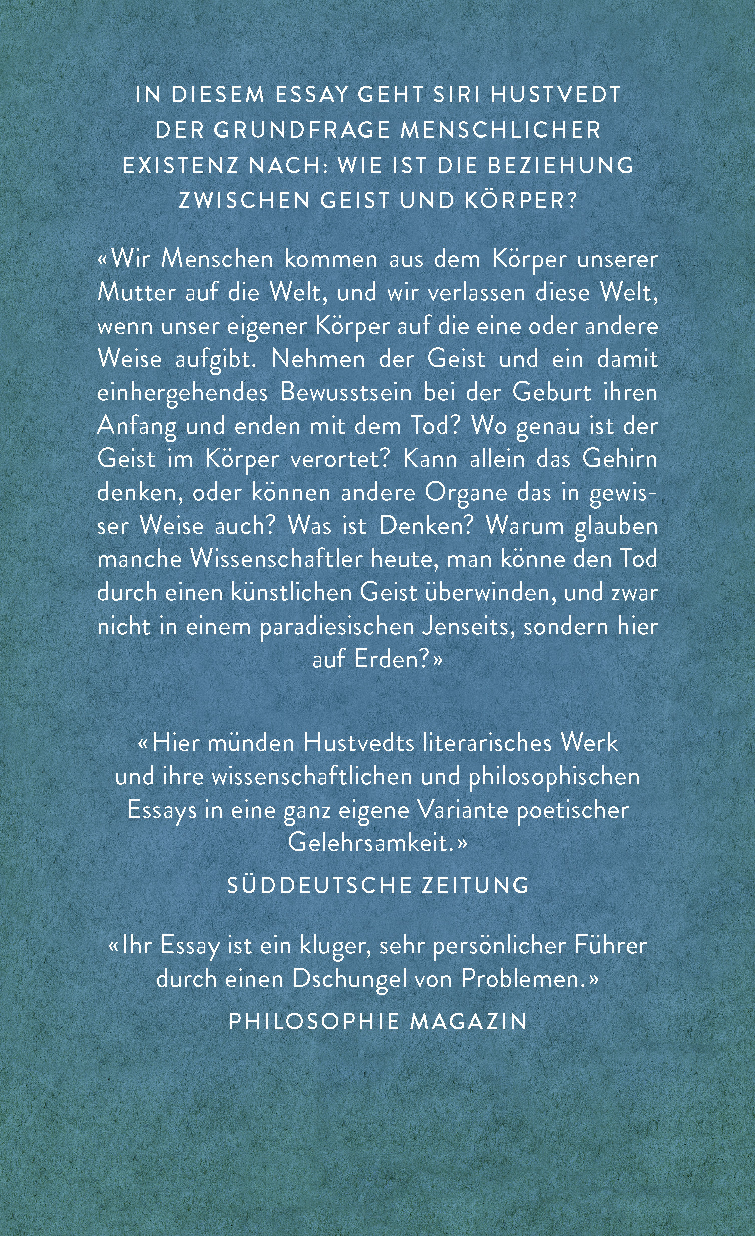 Mit ihrem multidisziplinären Zugang zeigt Hustvedt, wie sehr ungerechtfertigte Annahmen über Körper und Geist das Denken der Neurowissenschaftler, Genetiker, Psychiater, Evolutionspsychologen und der Forscher zur Künstlichen Intelligenz verzerrt und verwirrt hat.