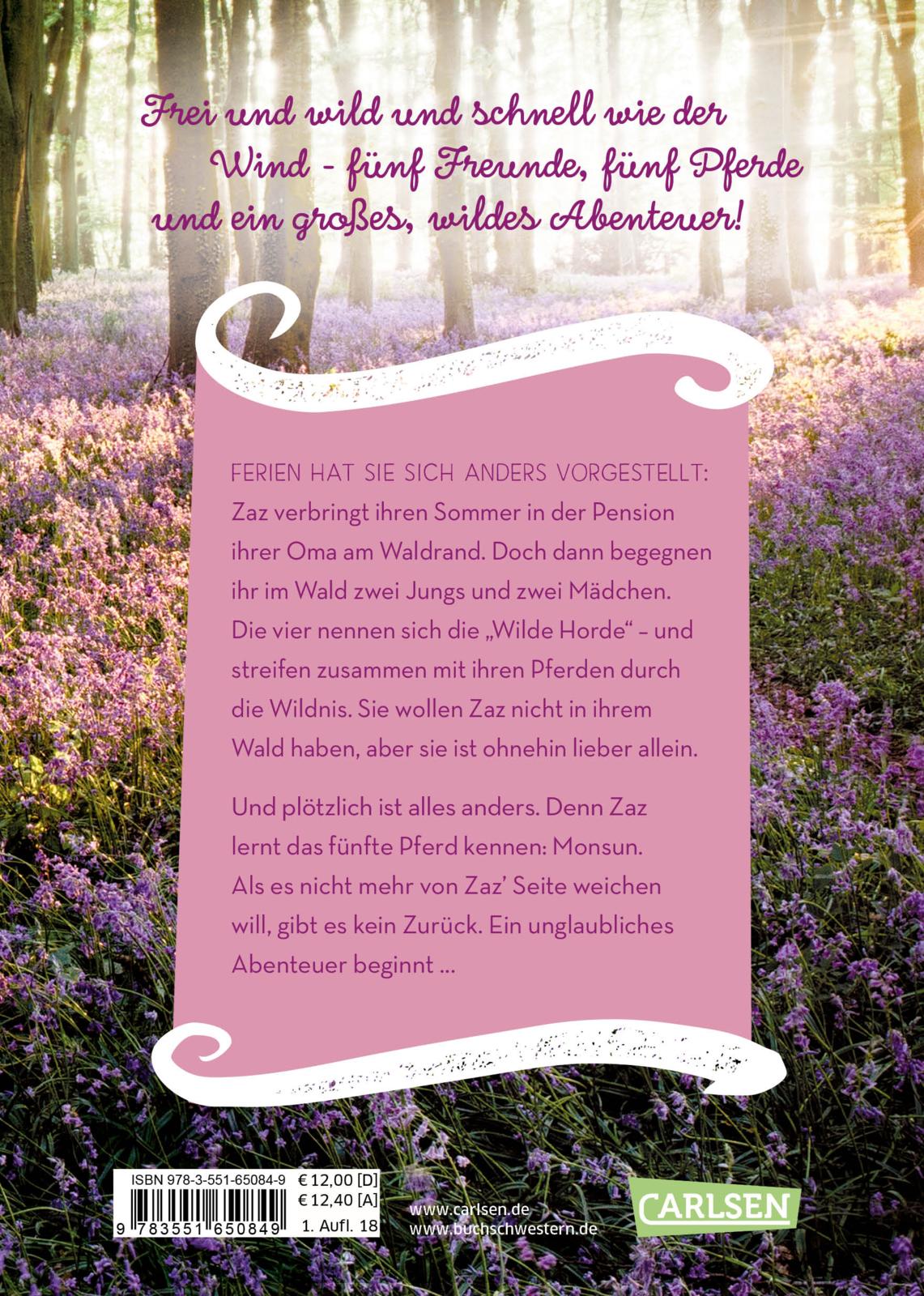 Zaz verbringt ihren Sommer in der Pension ihrer Oma am Waldrand - Ferien hat sie sich anders vorgestellt! Doch dann begegnen ihr im Wald zwei Jungs und zwei Mädchen. Die vier nennen sich die "Wilde Horde" - und streifen zusammen mit ihren Pferden durch die Wildnis. Sie wollen Zaz nicht in ihrem Wald haben, aber sie ist ohnehin lieber allein. Doch plötzlich ist alles anders. Denn Zaz lernt das fünfte Pferd kennen: Monsun. Als er nicht mehr von Zaz' Seite weichen will, gibt es kein Zurück. Ein unglaubliches Abenteuer beginnt ... ***