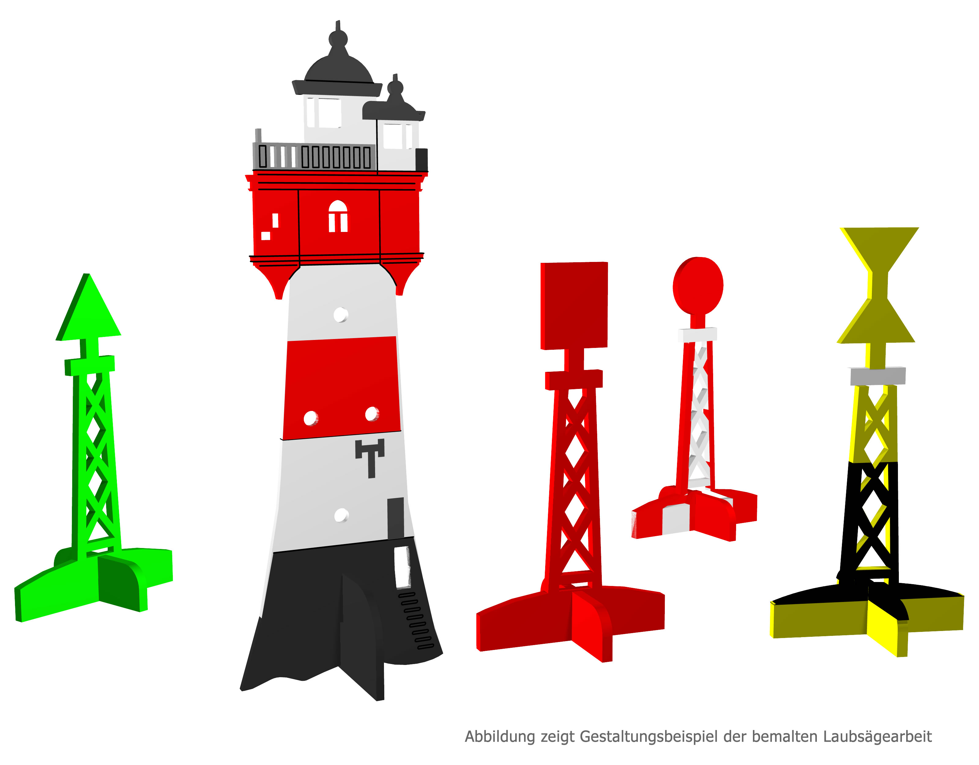 Standfähige Modelle von verschiedenen Seezeichen und dem Leuchtturm Roter Sand. Die Modelle können sehr detailliert ausgesägt werden und zeigen Lateral- und Kardinalzeichen. Die Bemalung sollte in den gezeigten Farben erfolgen, um der Realität zu entsprechen. Laubsägearbeiten bieten nicht nur stundenlangen Bastelspaß, sie fördern auch die Entwicklung des Kindes in den Bereichen Konzentration und motorische Fähigkeiten.