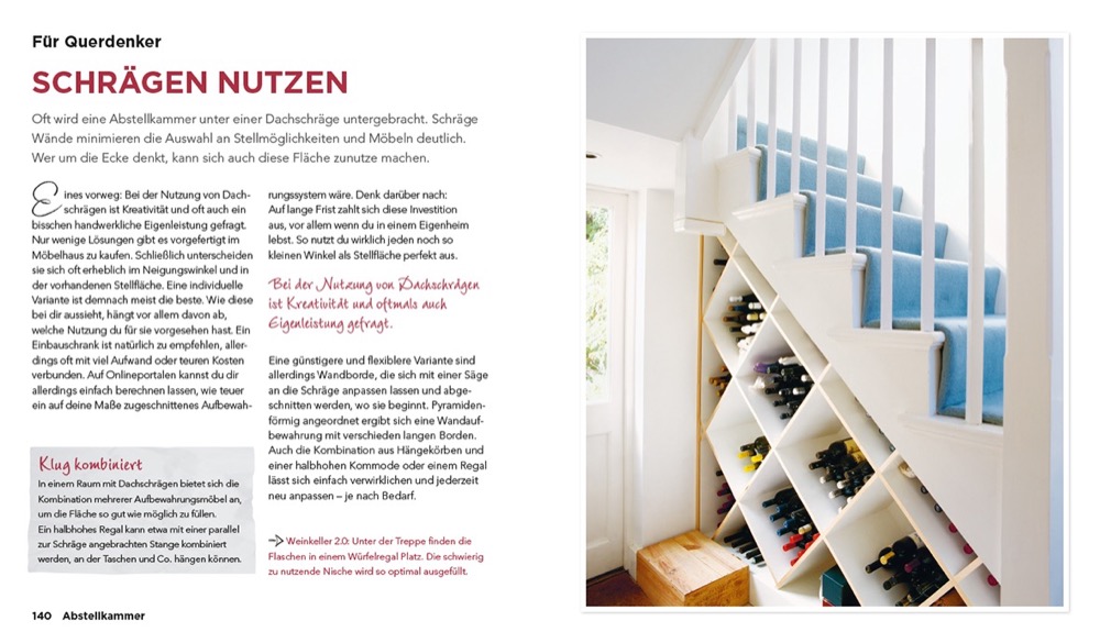 | Schlagworte | Anleitungen • Aufbewahrung • Chaos • Chaos beseitigen • Checklisten • Mehr Platz • Ordnung schaffen • ordnungshelfer • Platzmangel • Platz schaffen • Praktische Lösungen • Praktische Tipps • Praxisbuch Wohnen • Praxistipps • Stauraum • Stauraumideen • Stauraumlösungen • weniger Chaos • Wohnbuch • Wohnen • Wohnideen • Wohninspiration • Wohntipps |