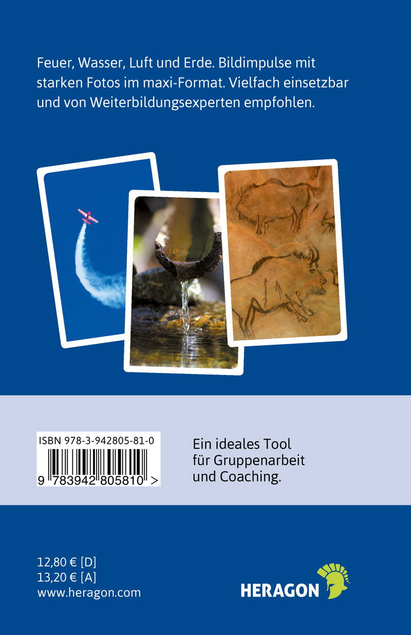 Feuer, Wasser, Luft und Erde. Bildimpulse mit starken Fotos im maxi-Format. Vielfach einsetzbar und von Weiterbildungsexperten empfohlen. Ein ideales Tool für Gruppenarbeit und Coaching.