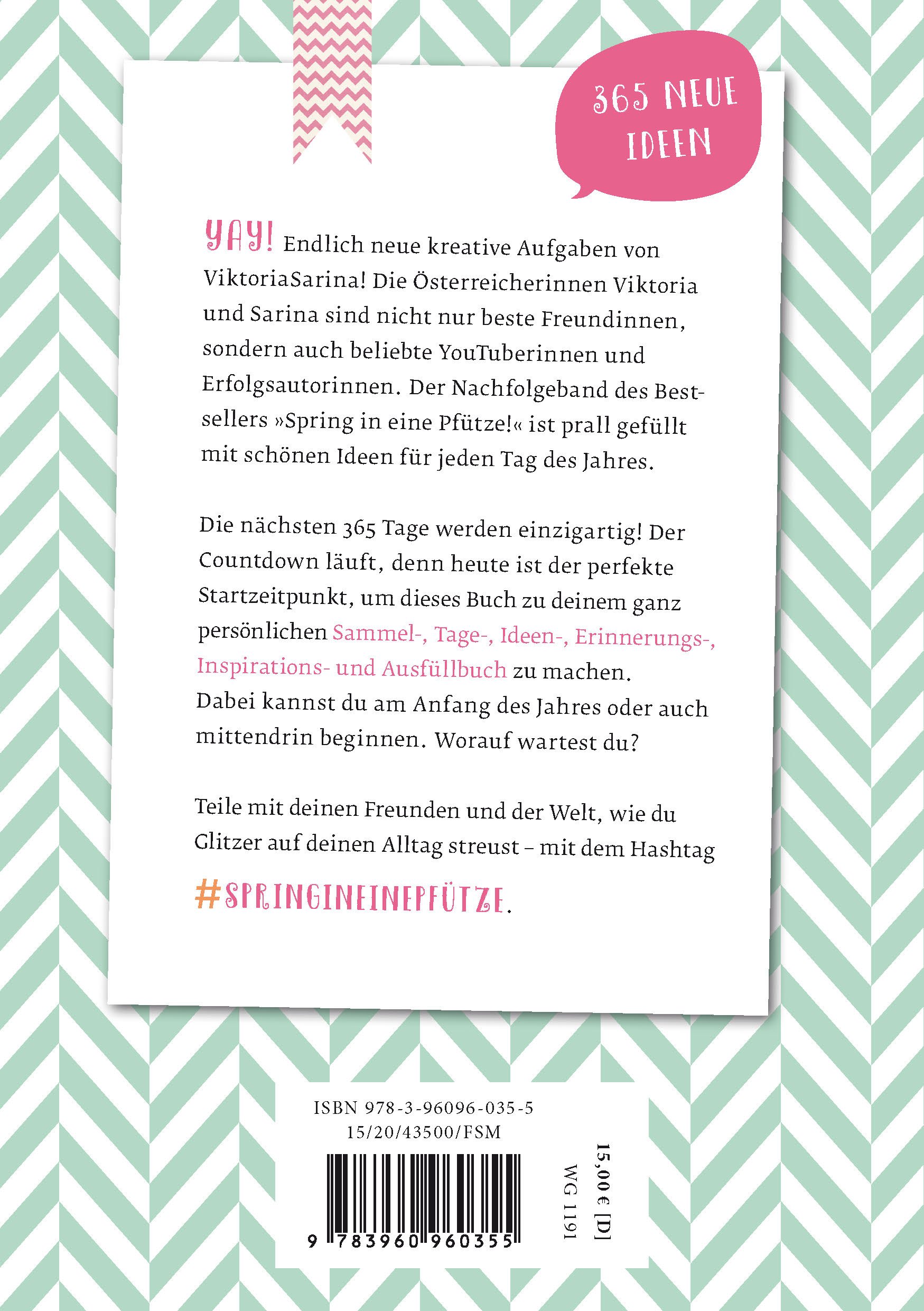 Endlich neue kreative Aufgaben! Der Nachfolger von "Spring in eine Pfütze" bietet ganz neue bunte Ideen für weitere 365 einzigartige, kreative Tage.Der zweite Band des Bestsellers "Spring in eine Pfütze" knüpft an das Erfolgsrezept des ersten Bandes an und bietet weiteren Stoff für die zahllosen Fans des Mitmachbuchs. Die Community bekommt für jeden Tag neue kreative Ideen, DIYs und Anleitungen, die sie weiterhin auf Instagram unter #springineinepfuetze teilen kann. Die neuen Aufgaben sind die perfekte Motivation, um Verrücktes, Buntes und Fröhliches auszuprobieren. Typisch ViktoriaSarina eben.Freude und Kreativität sind über einen langen Zeitraum garantiert!