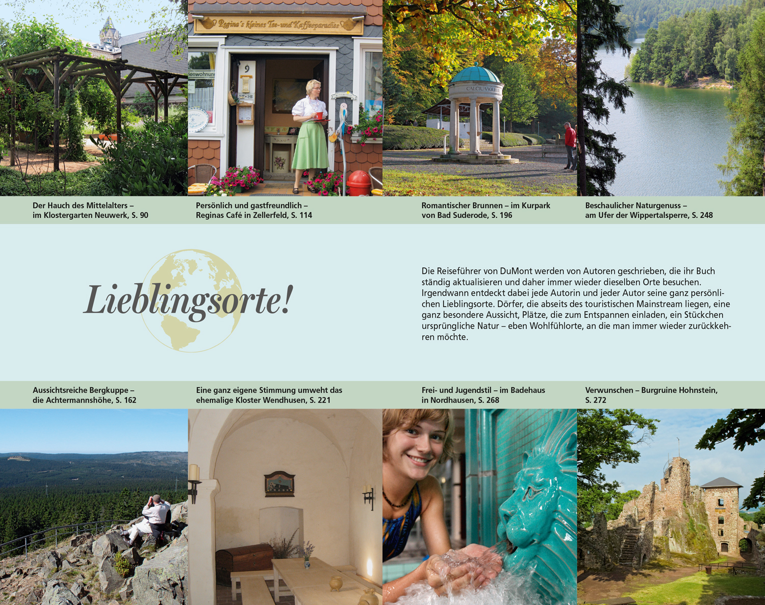 Aktivurlauber können mithilfe detaillierter Wegbeschreibungen den Brocken erklimmen oder durch die berühmte Bodeschlucht wandern. Keinesfalls versäumen sollten Sie den Besuch der persönlichen Lieblingsplätze der beiden Autoren - sei es die verwunschene Burgruine Hohnstein oder die Bergkuppe der Achtermannshöhe, von der man einen herrlichen Panoramablick über den Nationalpark bis zum Brocken genießt.
