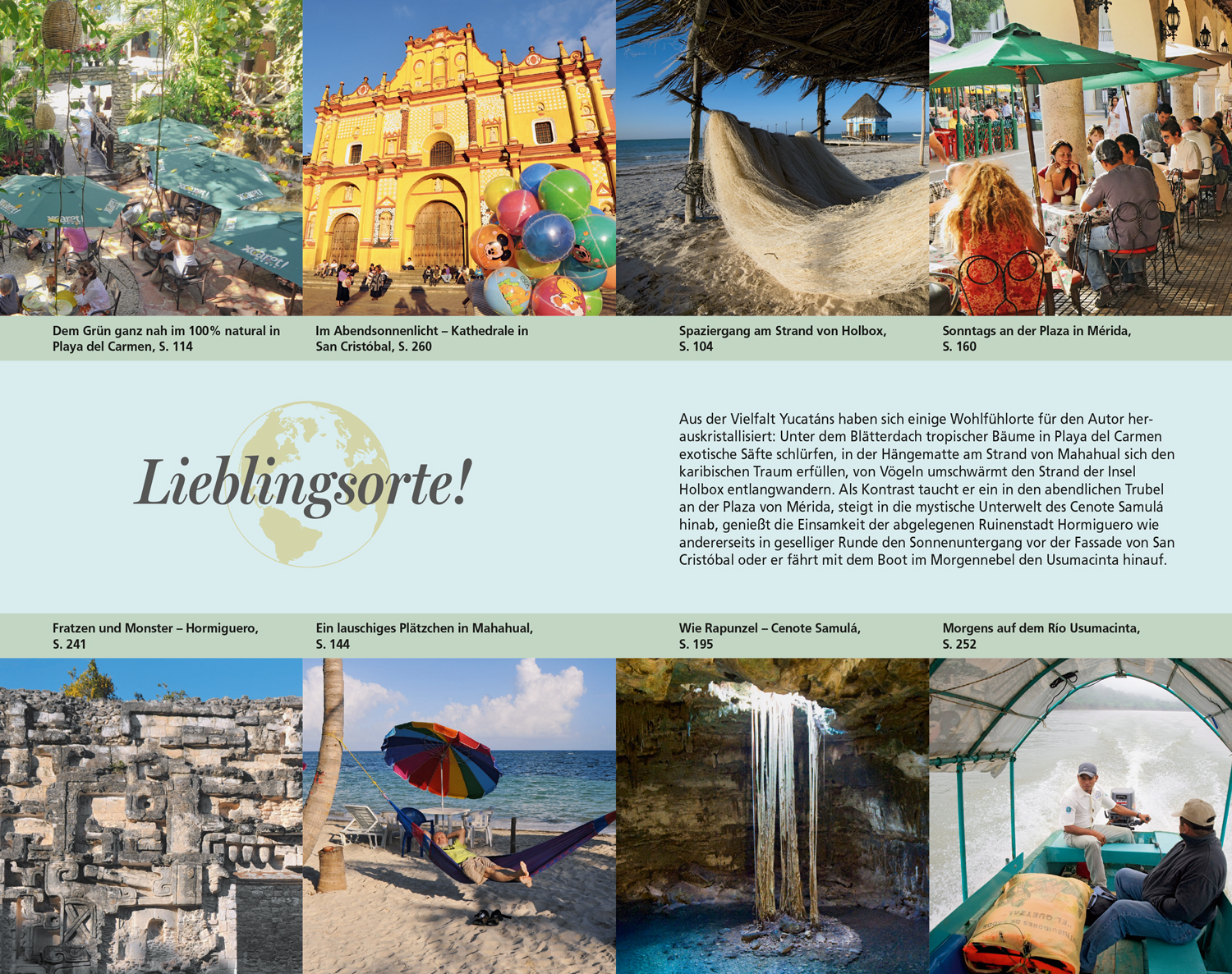 In der aktualisierten Auflage lädt der Autor ein, im neuen Museo Arte Popular de Yucatán in Mérida sich einmal genauer mit mexikanischer Volkskunst auseinanderzusetzen, bevor man sich eines der Souvenirs für zuhause aussucht. Ein Naturerlebnis der besonderen Art erlebt man bei einem Tauchgang mit bezaubernden Meereskreaturen wie dem vegetarischen Walhai. Innovativ und authentisch mexikanisch geht es in den zahlreichen neuen Restaurants zu, die dem Leser empfohlen wärmstens werden.