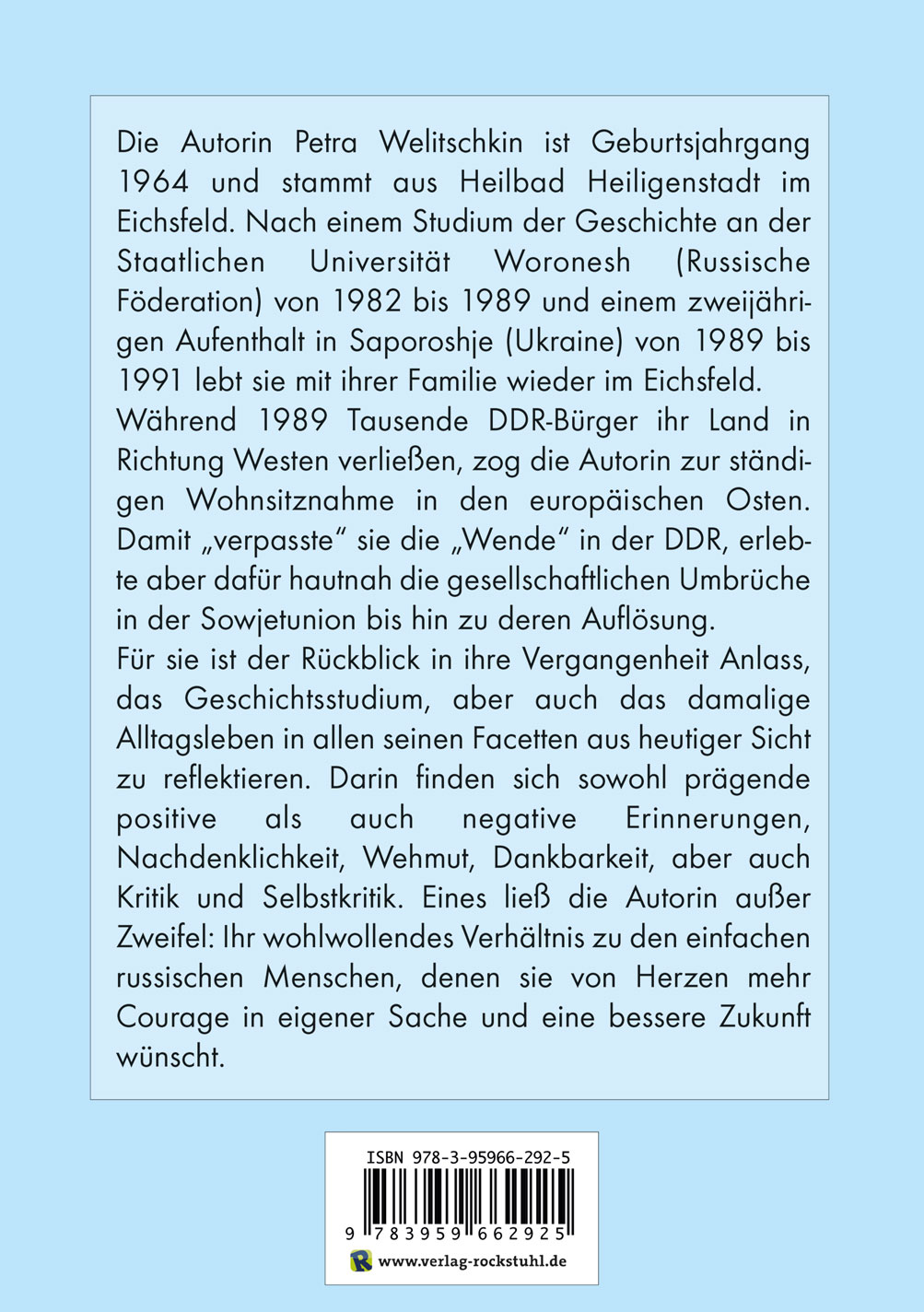 Während 1989 Tausende DDR-Bürger ihr Land in Richtung Westen verließen, zog die Autorin zur ständigen Wohnsitznahme in den europäischen Osten. Damit „verpasste“ sie die „Wende“ in der DDR, erlebte aber dafür hautnah die gesellschaftlichen Umbrüche in der Sowjetunion bis hin zu deren Auflösung.
