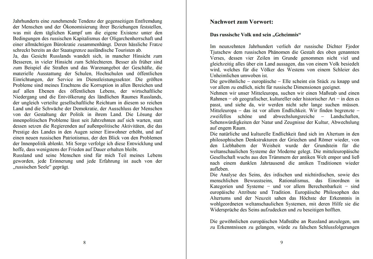 Für sie ist der Rückblick in ihre Vergangenheit Anlass, das Geschichtsstudium, aber auch das damalige Alltagsleben in allen seinen Facetten aus heutiger Sicht zu reflektieren. Darin finden sich sowohl prägende positive als auch negative Erinnerungen, Nachdenklichkeit, Wehmut, Dankbarkeit, aber auch Kritik und Selbstkritik. Eines ließ die Autorin außer Zweifel: Ihr wohlwollendes Verhältnis zu den einfachen russischen Menschen, denen sie von Herzen mehr Courage in eigener Sache und eine bessere Zukunft wünscht.