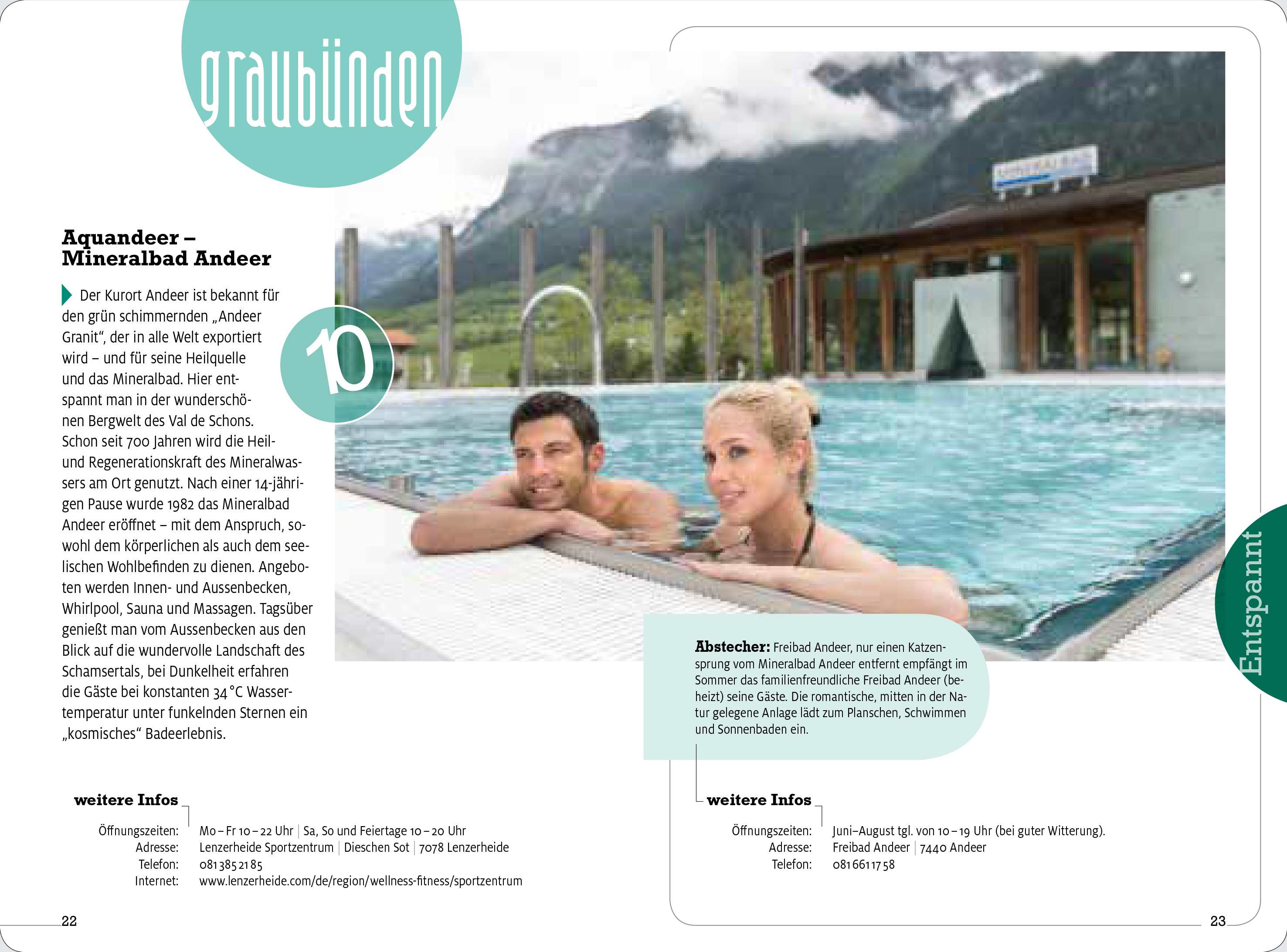 | Schlagworte | Enstpannt • Entspannung • Erlebnis • Erlebnisbäder • Erlebnis Schweiz • Freibäder • Freizeitaktivitäten Schweiz • Freizeitbuch • Freizeitbuch Schweiz • Freizeitführer • Hammam • Idyllische Naturseen • Schweiz • Spa • Strandbäder • Thermalbäder • Wasserspass • Wellness • Wellnessbuch • Wellnessführer • Wellness-Oasen |
