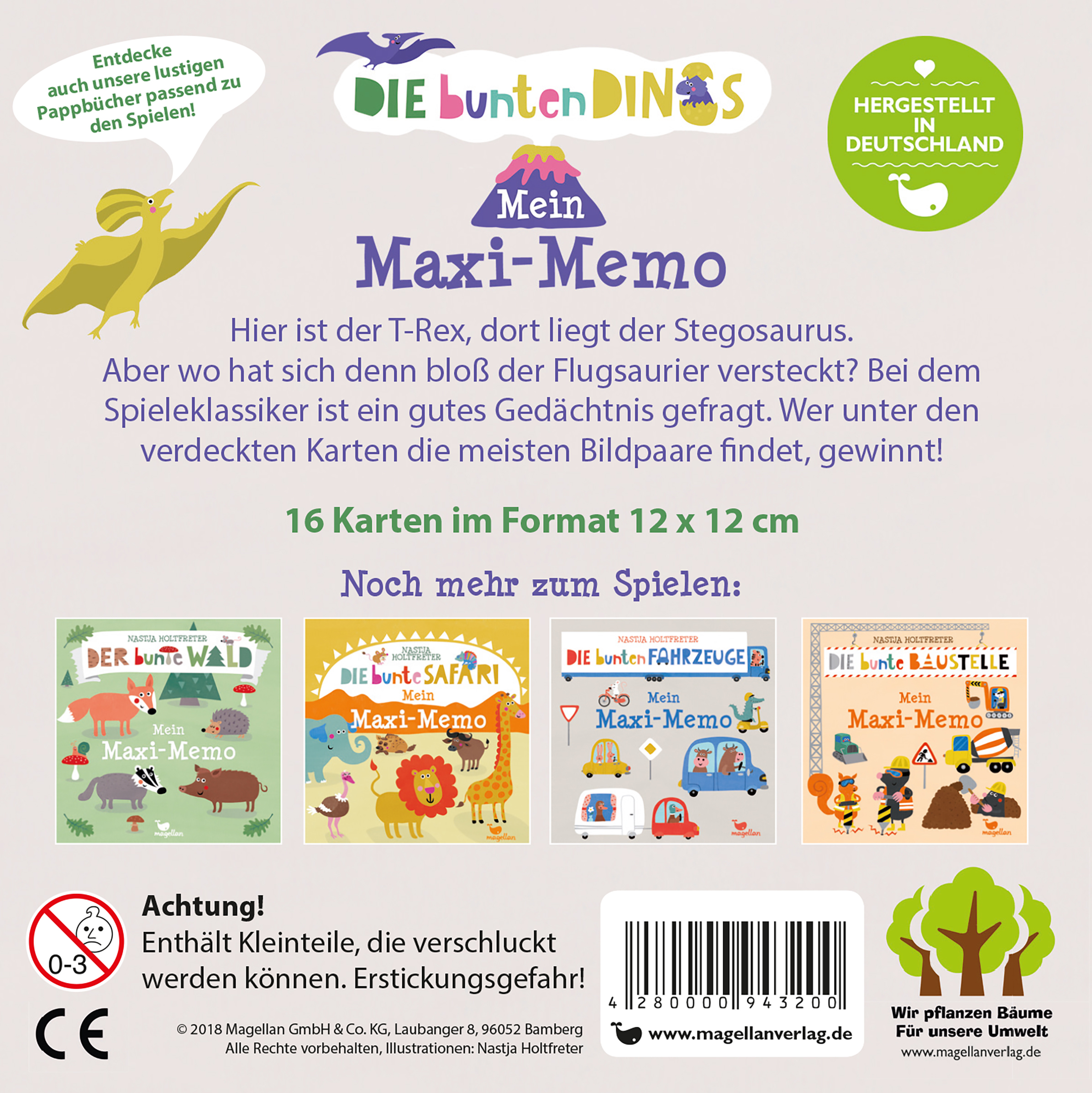 | Schlagworte | Die bunte Welt • Dinosaurier, Urzeit, T-Rex • Dinos, Dinosaurier, Urzeit • Gedächtnis trainieren • Kombinierbar mit anderen Titeln der Reihe • Konzentration fördern • Konzentration trainieren • Mein Maxi-Memo • Memo-Spiel • Nastja Holtfreter Bunte Welt • Spieleklassiker • Spielerisch Konzentration/Gedächtnis fördern • Spiel für Kindergartenkinder ab 3 Jahren • Suchen und Entdecken • T-Rex |