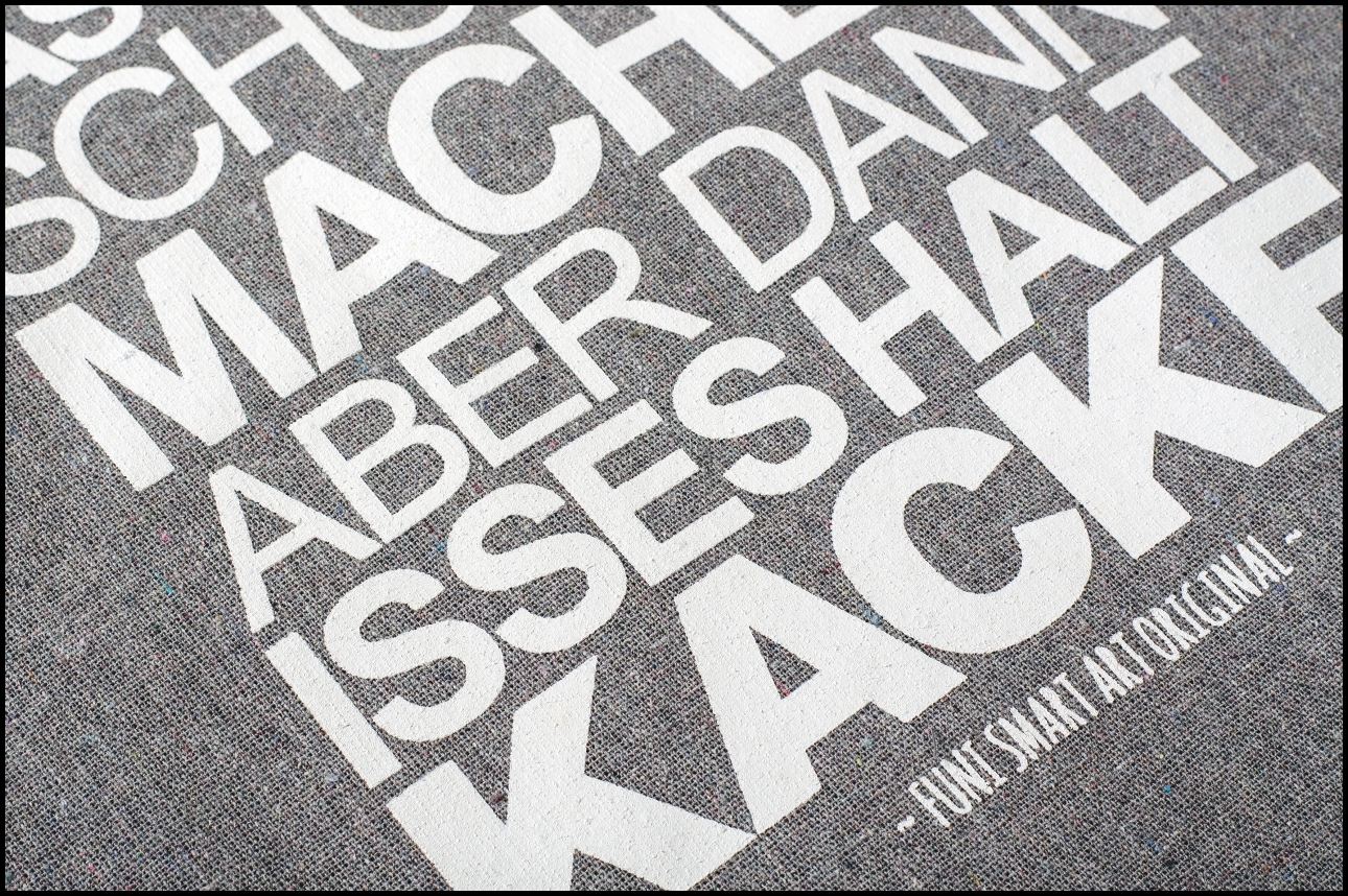 Schlicht gehalten in grau mit weißer Schrift, ist die Stofftasche ein Hingucker und Garant für gute Laune und ein Schmunzeln.