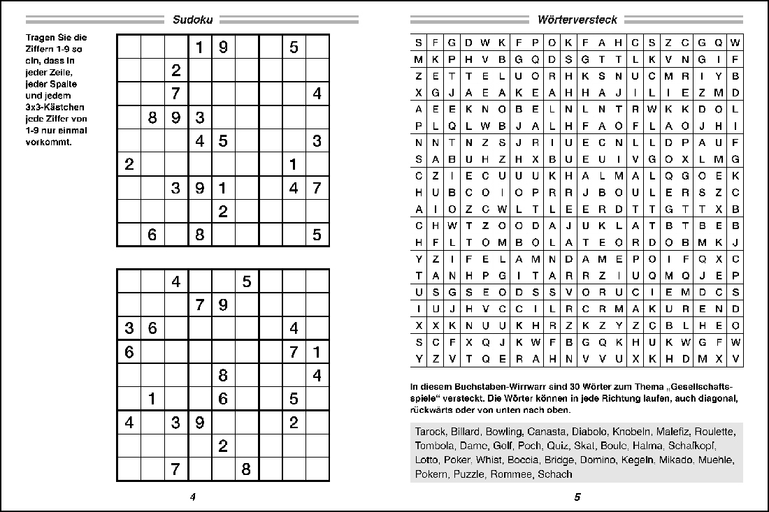 | Schlagworte | Fehlersuche • Gitterrätsel • Großschrift • Kakuro • Knobeln • Kombirätsel • Kreuzworträtsel • Kreuzworträtselbuch • Kreuzworträtselheft • lösen • Magische Quadrate • Puzzle • Rätsel • Rätselbuch • Rätselheft • Rätselmix • Rätseln • Schüttelrätsel • Schwedenrätsel • Wabenrätsel • Wörterversteck • Zahlensuche |