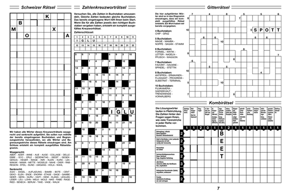 | Schlagworte | Fehlersuche • Gitterrätsel • Kakuro • Knobeln • Kombirätsel • Kreuzworträtsel • Kreuzworträtselbuch • Kreuzworträtselheft • lösen • Magische Quadrate • Puzzle • Rätsel • Rätselbuch • Rätselheft • Rätselmix • Rätseln • Schüttelrätsel • Schwedenrätsel • Wabenrätsel • Wörterversteck • Zahlensuche |