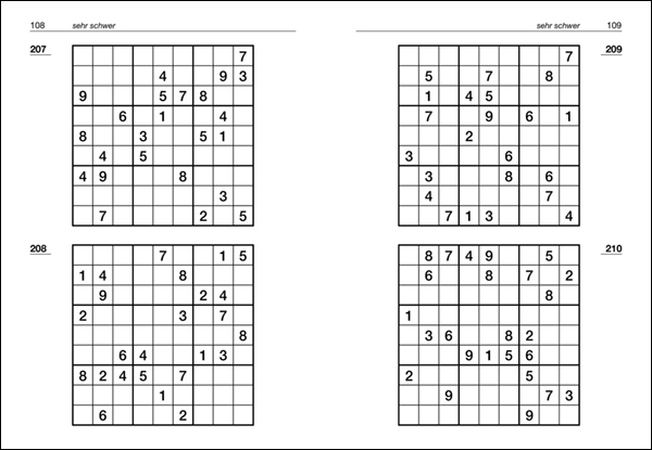 Das aus Japan kommende Rätsel Sudoku besteht aus neun quadratischen 3 x 3-Blöcken, wobei jeder quadratische Block in drei Reihen mit jeweils drei Kästchen unterteilt ist. In jedem quadratischen 3 x 3-Block sind Zahlen zwischen 1 und 9 vorgegeben. Diese vorgegebenen Zahlen gilt es so zu ergänzen, dass jede Zahl zwischen 1 und 9 nur einmal vorkommt. Auch in den neun Spalten und neun Zeilen des gesamten Sudoku-Rätsels dürfen die Zahlen von 1 bis 9 nur einmal vorkommen. Die Sudoku-Rätsel sind in die Schwierigkeitsstufen sehr leicht, leicht, mittelschwer, schwer und sehr schwer eingeteilt.