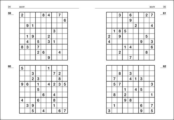 Das aus Japan kommende Rätsel Sudoku besteht aus neun quadratischen 3 x 3-Blöcken, wobei jeder quadratische Block in drei Reihen mit jeweils drei Kästchen unterteilt ist. In jedem quadratischen 3 x 3-Block sind Zahlen zwischen 1 und 9 vorgegeben. Diese vorgegebenen Zahlen gilt es so zu ergänzen, dass jede Zahl zwischen 1 und 9 nur einmal vorkommt. Auch in den neun Spalten und neun Zeilen des gesamten Sudoku-Rätsels dürfen die Zahlen von 1 bis 9 nur einmal vorkommen. Die Sudoku-Rätsel sind in die Schwierigkeitsstufen sehr leicht, leicht, mittelschwer, schwer und sehr schwer eingeteilt.