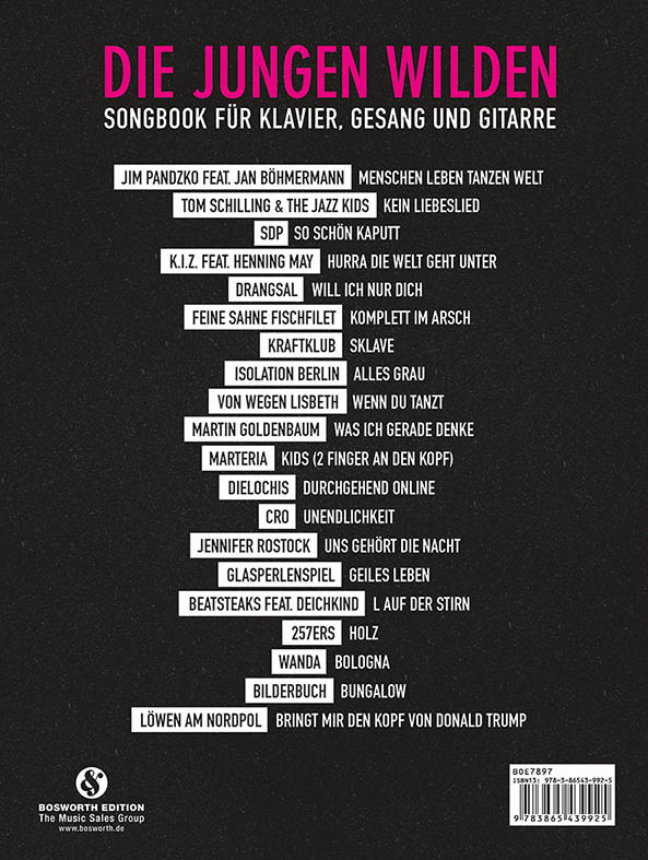 | Schlagworte | CRO • DieLochis • Feine Sahne Fischfilet • Glasperlenspiel • Isolation Berlin • Ja, Panik • Jennifer Rostock • Klavier, Gitarre, Gesang • Kraftklub • Marteria • Noten • Pop Österreich • PVG • Songbook • Von wegen Lisbeth • Wanda |