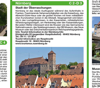 Mittelalterlich geprägte Städte, Burgen, Tropfsteinhöhlen, ausgedehnte Wälder, Flüsse und der Rhein-Main-Donau-Kanal prägen die Landschaft der Frankenalb rund um Nürnberg. Einige Strecken des gut ausgebauten Radwegenetzes erfordern angesichts deutlicher Steigungen etwas Kondition von den Radlern. Abseits von Hektik und Trubel lässt sich abschalten und viel erleben. Wo sich Zwischenstopps lohnen, erfährt man auf der Rückseite der Radwanderkarte.