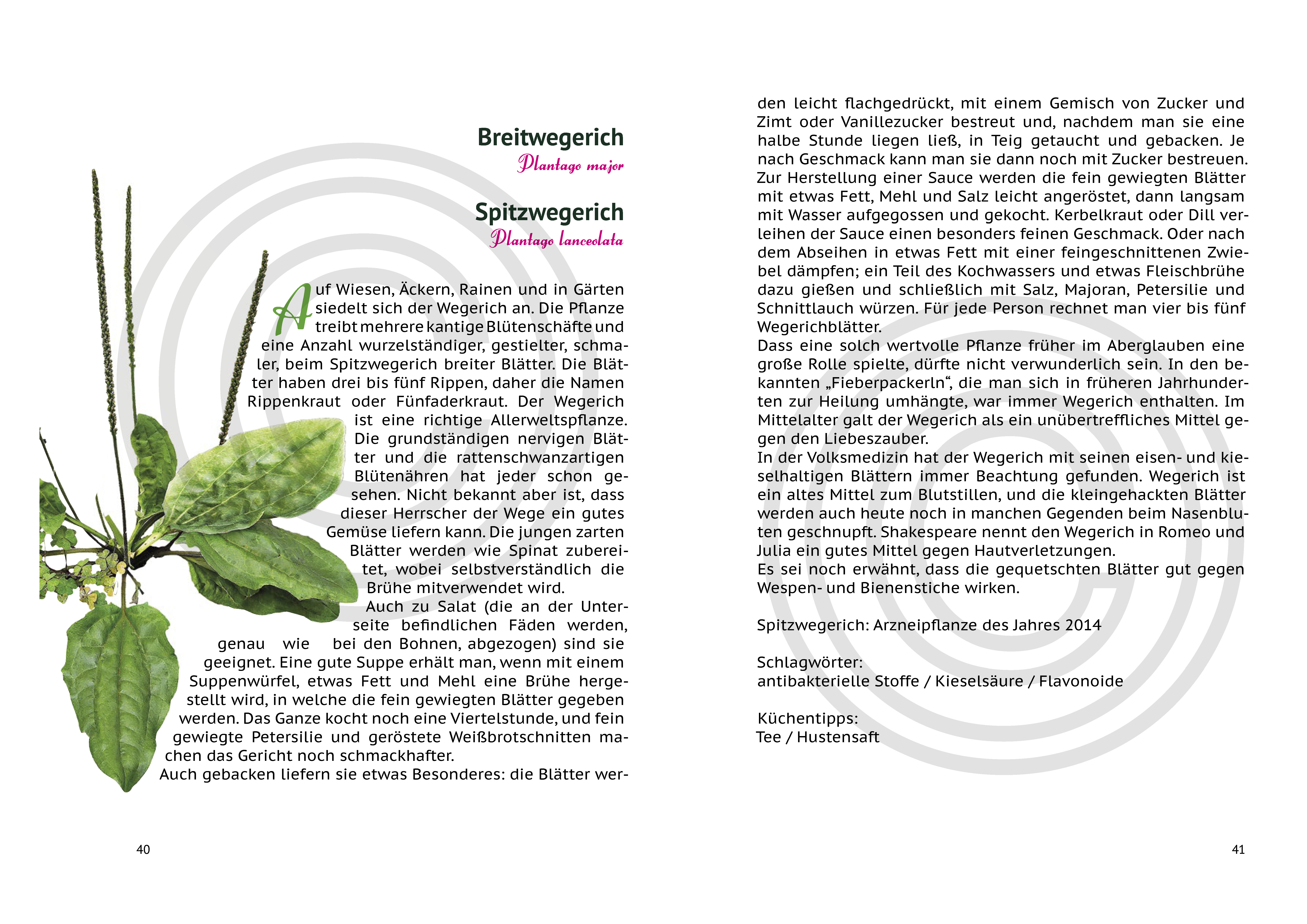 | Zusatzinfo | Illustrationen zu den vorgestellten Kräutern, Pilzen und Pflanzen: Brunnenkresse, Gänseblümchen, Große Brennnessel, Schafgarbe, Löwenzahn, Vogelmiere, Huflattich, Hopfen, Wegwarte, Gundermann, Wiesenschaumkraut, Sauerampfer, Wegerich, Scharbockskraut, Geißfuß, Gänsefuß, Hirtentäschelkraut, Steinpilz, Kuhpilz, Hallimasch, Echter Reizker, Wiesenchampignon, Ziegenbart, Ziegenlippe, Butterpilz, Pfifferling, Borretsch, Portulak, Biberfelle, Gänsefingerkraut, Wiesenknopf, Ackerdistel |