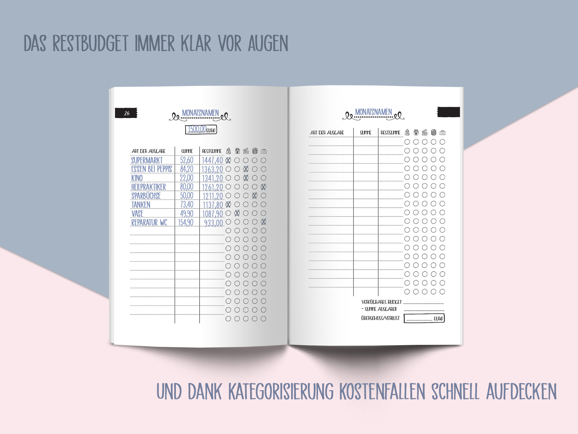 - Ausreichend Platz für die Eintragung variabler Ausgaben ( Lebensmittel, Restaurantbesuche, Geschenke, etc.) nach Monaten geordnet