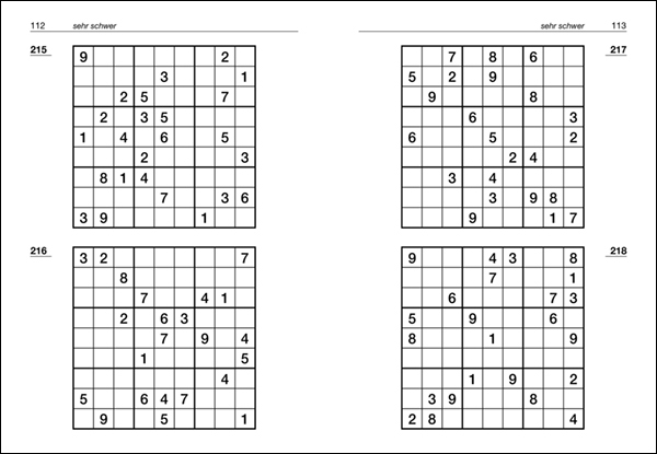 Das aus Japan kommende Rätsel Sudoku besteht aus neun quadratischen 3 x 3-Blöcken, wobei jeder quadratische Block in drei Reihen mit jeweils drei Kästchen unterteilt ist. In jedem quadratischen 3 x 3-Block sind Zahlen zwischen 1 und 9 vorgegeben. Diese vorgegebenen Zahlen gilt es so zu ergänzen, dass jede Zahl zwischen 1 und 9 nur einmal vorkommt. Auch in den neun Spalten und neun Zeilen des gesamten Sudoku-Rätsels dürfen die Zahlen von 1 bis 9 nur einmal vorkommen. Die Sudoku-Rätsel sind in die Schwierigkeitsstufen sehr leicht, leicht, mittelschwer, schwer und sehr schwer eingeteilt.