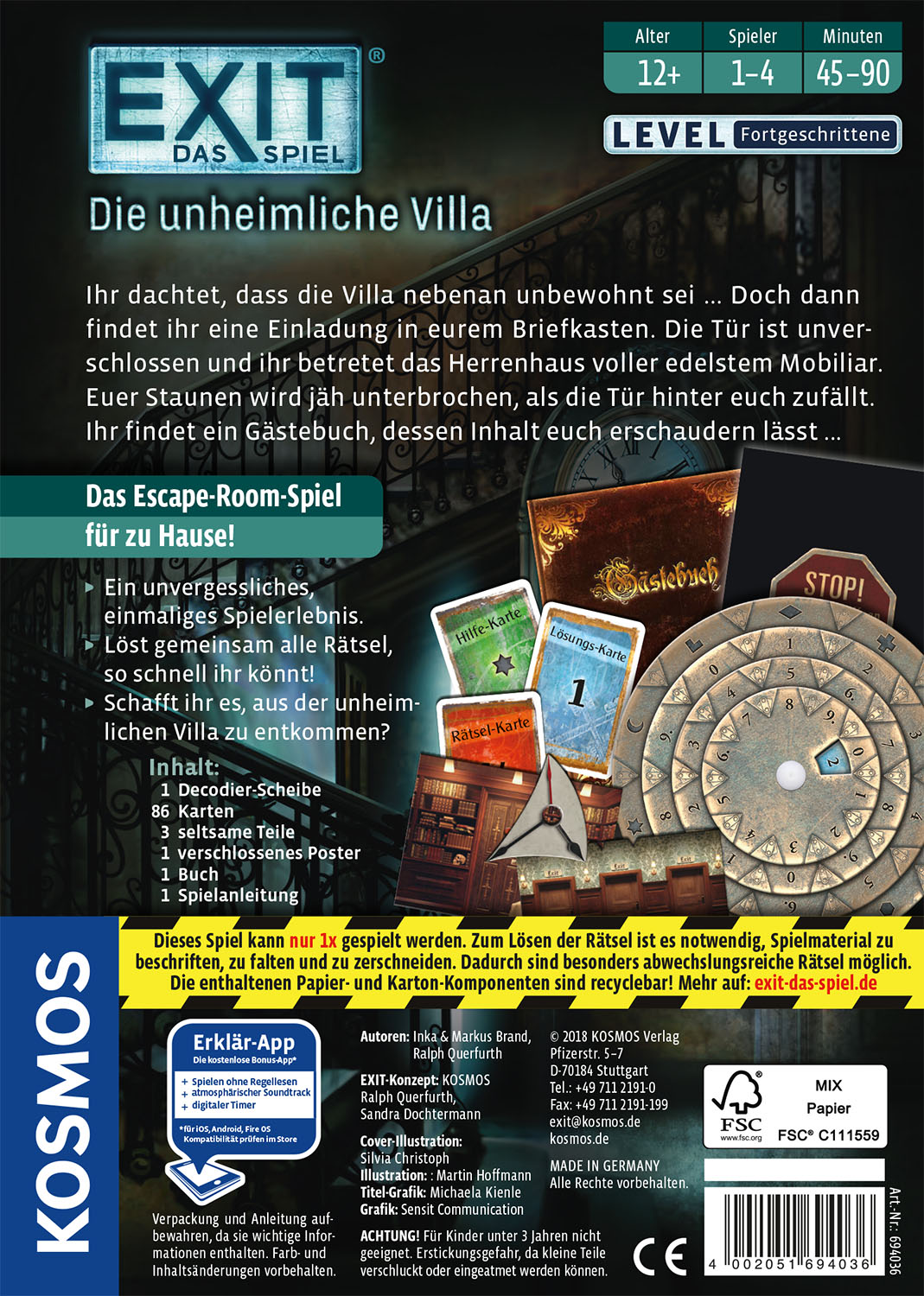 Aus der erfolgreichen Spielereihe "EXIT® - Das Spiel". Das Escape-Room-Spiel für zu Hause. Könnt ihr die Rätsel lösen? 1-4 SpielerInnen lösen im Team clevere Rätsel und brauchen dazu Teamgeist, Kreativität und Kombinationsgeschick. Kooperatives Erlebnisspiel im Level: Fortgeschrittene. Mit Tutorial und Timer in der kostenlosen KOSMOS-Erklär-App. Mit und ohne App spielbar. Gesellschaftsspiel für Erwachsene, Fans von Live Escape Rooms und Familien ab 12 Jahren. Ideal als Partyspiel, Eventspiel und als Geburtstagsgeschenk. Da die Materialien für die außergewöhnlichen Rätsel verändert werden, nur einmal spielbar! Ihr seid in eine Villa eingeladen. Doch nach eurer Ankunft stellt ihr fest, ihr Teil eines makabren Spiels geworden seid. Und es bleibt nicht viel Zeit, die Rätsel zu lösen, um aus der Villa zu fliehen.Mit der Reihe "EXIT® - Das Spiel" bringt KOSMOS das Gefühl der Live-Escape-Rooms zu euch nach Hause. Jede Box bietet einer Gruppe von 1 bis 4 Personen ein außergewöhnliches Spielerlebnis für einen einmaligen und absolut unvergesslichen Abend! Der Wettlauf gegen die Zeit und die cleveren Rätsel dieser innovativen Spielreihe sorgen für Spannung und geistige Herausforderung in den eigenen vier Wänden. Um die Rätsel zu lösen und sich somit gemeinsam aus der misslichen Lage zu befreien ist Teamgeist gefragt! Also arbeitet gut zusammen, denn die Zeit läuft...Live-Escape-Feeling im Fortgeschrittenen-Level.Inhalt: 1 Buch, 1 Decodier-Scheibe, 26 Rätsel-Karten, 30 Lösungs-Karten, 30 Hilfe-Karten, 1 verschlossenes Poster, 3 seltsame Teile, 1 Spielanleitung