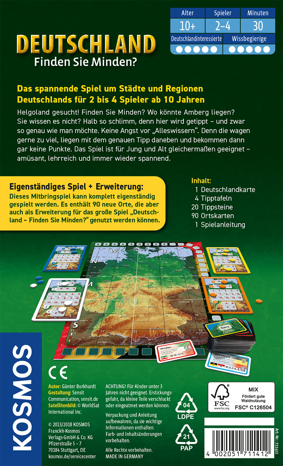 gt; Geografie-Wissen spielend auf die Probe stellen und erweitern. > Stand-alone-Spiel und auch kombinierbar mit dem großen Spiel. Helgoland gesucht! Finden Sie Minden? Wo könnte Amberg liegen? Sie wissen es nicht? Halb so schlimm, denn hier wird geschätzt, und zwar so genau wie man möchte. Keine Angst vor Geografie-Kennern, denn die wagen gerne zu viel, liegen mit dem genauen Tipp daneben und bekommen dann gar keine Punkte. Das Spiel ist für Jung und Alt gleichermaßen geeignet - amüsant, lehrreich und immer wieder spannend. Eigenständiges Spiel und Erweiterung: Dieses Mitbringspiel kann komplett eigenständig gespielt werden. Es enthält 90 neue Orte, die aber auch als Erweiterung für das große Spiel "Deutschland - Finden Sie Minden?" genutzt werden können. Für 2 bis 4 Spieler ab 10 Jahren. Spieldauer: ca. 30 Minuten.