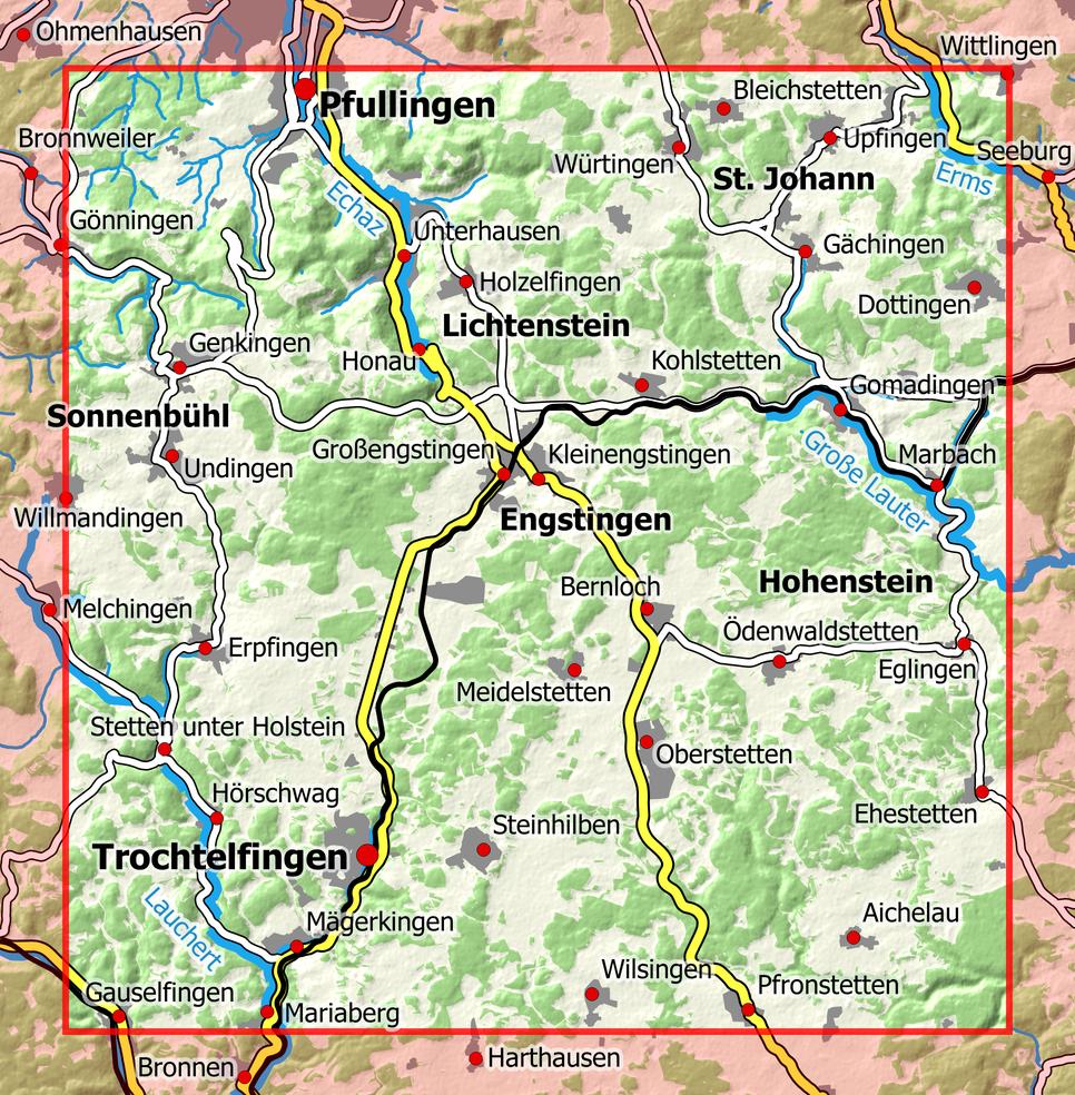 | Schlagworte | 1 : 25 000 • 1:25000 • 25000 • Engstingen • Fahrrad • Freizeit • Hohenstein • Landkarte • Lichtenstein • Natur • Pfullingen • radfahren • Radwanderkarte • Radwandern • Radwege • Sonnenbühl • St. Johann • Topografie • Topografisch • Topographie • Topographisch • Topographische Karte • Trochtelfingen • Wanderkarte • Wandern • Wanderwege |
