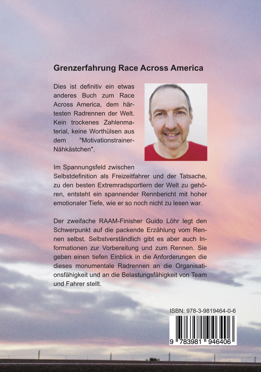 Das Race Across America gilt als härtestes Radrennen der Welt. 2017 bestritt der Extremradsportler Guido Löhr dieses Rennen zum zweiten mal und gewann dabei nicht nur die Altersklassenwertung, sondern belegte einen sensationellen dritten Platz in der der Gesamtwertung.Um dieses Ziel zu erreichen und die 4930 Kilometer, die es nonstop zu bewältigen galt, in der erforderlichen Zeit zurückzulegen, musste er 500 Kilometer am Tag mit dem Rennrad zurücklegen. Dass er dabei an seine mentale und körperliche Grenze gehen musste versteht sich fast von selbst.Wie es ist, sich an dieser Grenze zu bewegen, und wie man dorthin gelangt, beschreibt Löhr in einem packenden Rennbericht vom Race Across America 2017, welcher den Hauptteil des Buches bildet. Im ersten Teil wird das Race Across America (RAAM) kompakt erklärt, außerdem wird das Begleitteam und die Gegner vorgestellt.Illustriert wird das Buch durch über 100 Bilder, die (bis auf wenige Ausnahmen) der Fotograf Saron Duchardt während des Rennens schoss. Durch die hochwertige Papierauswahl und den Qualitätsdruck kommen diese Fotos wunderbar zur Geltung. Dabei wurde bei der Gestaltung des Buches darauf geachtet, den Lesefluss nicht zu stören.