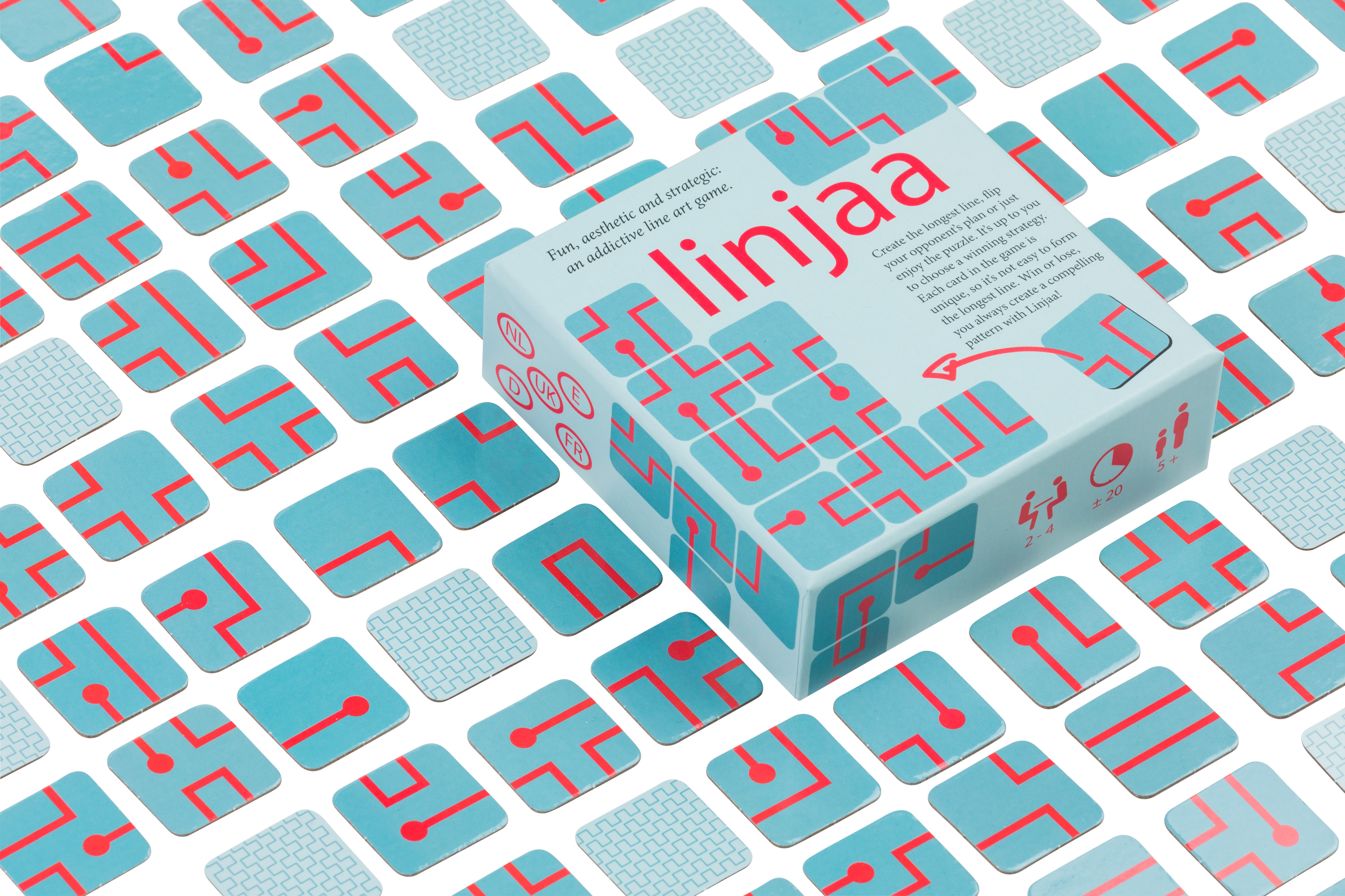 Linjaa is a multi-player edge-matching game. When adding a new card to the playing field, you gather points when finishing a line or a ‘circle’. Cards can only be combined when the lines on your card match the lines on the cards already in the field. Concentrate on your own plan or sabotage the plans of your fellow players: it’s up to you to choose which line to take. Whoever succeeds in finishing the most and the longest lines, wins the game.