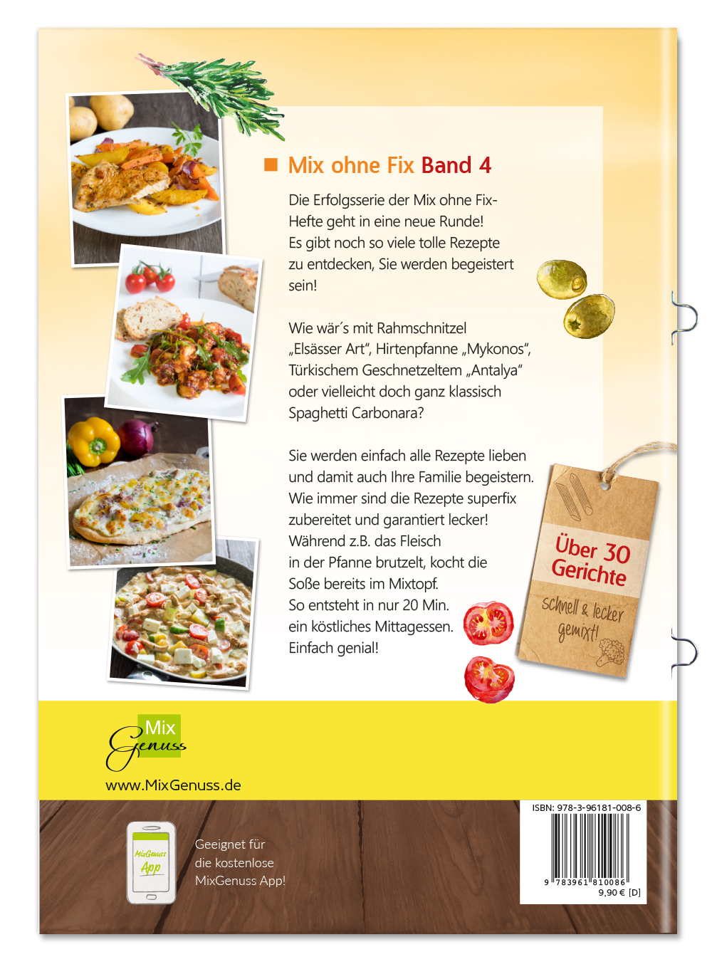 Die Erfolgsserie der Mix ohne Fix-Hefte geht in eine neue Runde! Es gibt noch so viele tolle Rezepte zu entdecken, Sie werden begeistert sein!Wie wär´s mit Rahmschnitzel ''Elsässer Art'', Hirtenpfanne ''Mykonos'', Türkischem Geschnetzeltem ''Antalya'' oder vielleicht doch ganz klassisch Spaghetti Carbonara?Sie werden einfach alle Rezepte lieben und damit auch Ihre Familie begeistern. Wie immer sind die Gerichte superfix zubereitet und garantiert lecker!Während z.B. das Fleisch in der Pfanne brutzelt, kocht die Soße bereits im Mixtopf. So entsteht in nur 20 Min. ein köstliches Mittagessen. Einfach genial!Alles auf einen Blick:Anzahl der Rezepte: 35 (keine Vegetarischen)Davon Pfannengerichte: 17Davon Ofengerichte: 12Davon All-in-One/One-Pot-Gerichte: 4Davon Würzmischungen: 2Von den 35 Rezepten sind 5 davon mit Nudeln.Rezeptübersicht:Pak Choi Beef mit Teriyaki-WürzpasteRucola-Tomaten-HähnchenSüßkartoffel-Puten-GulaschPutenschnitzel mit Kartoffeln und KarottenKalbsschnitzel al LimoneHähnchenschnitzel mit OlivenkrusteSoljanka - herzhaft pikantRahmschnitzel "Elsässer Art"Bistro-Baguette "Hawaii"Rustikali - helles OfenbrotSchlemmerfilet "Bordelaise"Seelachs in Kräuter-Sahne-SoßeHähnchen süß-sauerOfen-Schnitzel "Hawaii"Hirtenpfanne "Mykonos"Türkisches Geschnetzeltes "Antalya"Italienische SchlemmerbällchenHackfleisch-Schafskäse-AuflaufSchaschliktopf mit Speck und PaprikaCurrywurst in pikanter SoßeOfen-Gyros in cremiger SoßePaprika-Rahm-SchnitzelOfen-Schnitzel "Toskana"Mini-Schnitzel Tomate-MozzarellaSpargel-Pasta mit LachsOfen-Nudeln alla ChefGebratene SchinkennudelnSpaghetti CarbonaraPfeffer-Rahm-GeschnetzeltesWürzmischung für JägersoßeFilettopfWürzmischung für ZwiebelsuppeZwiebelhähnchenZwiebel-DipZwiebelhackbällchen