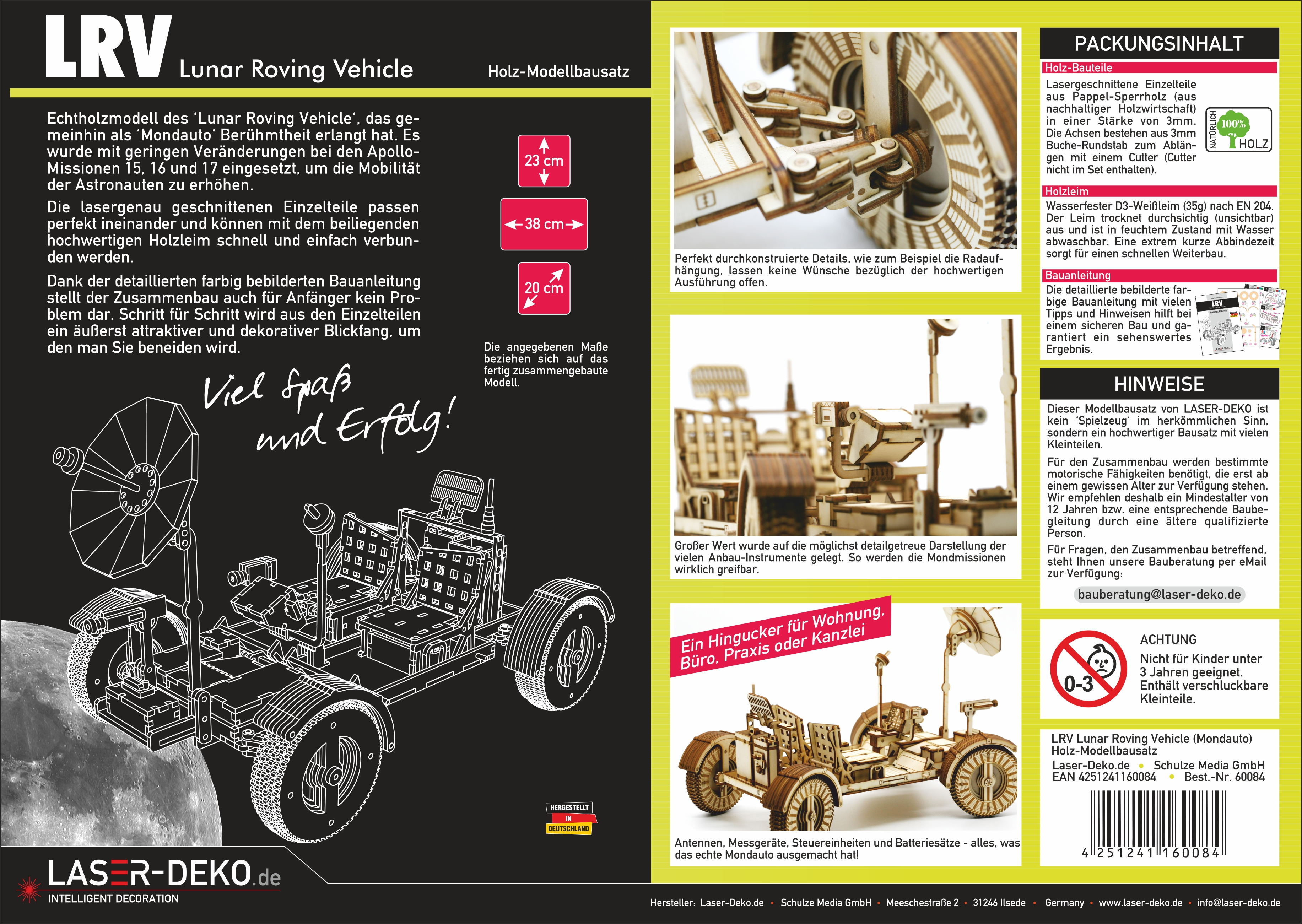 Echtholzmodell des bekannten 'Lunar Roving Vehicle', das gemeinhin als 'Mondauto' Berühmtheit erlangt hat. Es wurde mit geringen Veränderungen bei den Apollo-Missionen 15, 16 und 17 eingesetzt, um die Mobilität der Astronauten zu erhöhen. Viele Stunden ungetrübter Bastelspaß liegen vor Ihnen. Die lasergenau geschnittenen Einzelteile passen perfekt ineinander. Eine farbige und vollständig bebilderte 10-seitige Bauanleitung führt Sie in einfachen und nachvollziehbaren Schritten sicher zum Ziel. Am fertig zusammengebauten Modell können verschiedene Antennen und Messgeräte bewegt werden, die Sitzflächen können wie beim Original hochgeklappt werden, um an die darunterliegenden Behälter zu gelangen und als besonderes Highlight können alle vier Räder unabhängig voneinander Lenkbewegungen ausführen! So kann Ihr Modell 'in Action' gezeigt werden oder als reines Anschauungsobjekt alle Blicke auf sich ziehen. Für den Fall, dass Sie das Modell dauerhaft zusammenbauen möchten, legen wir eine Tube Holzleim bei. Das zusammengebaute Modell hat eine Größe von ca. 38 x 20 x 23 cm (LxBxH) ACHTUNG: Nicht geeignet für Kinder unter 3 Jahren. Enthält verschluckbare Einzelteile.