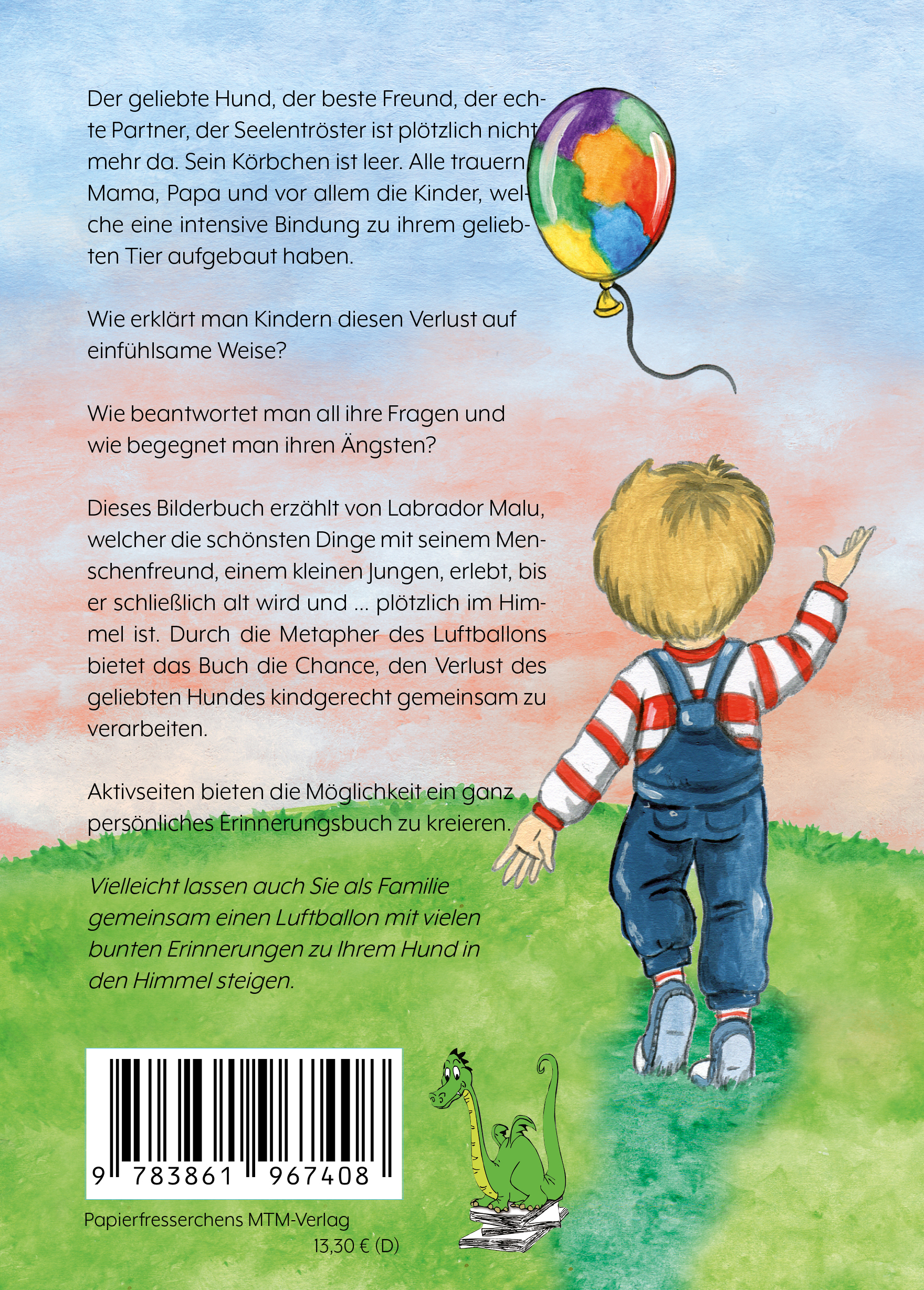 Dieses Bilderbuch erzählt von Labrador Malu, welcher die schönsten Dinge mit seinem Menschenfreund, einem kleinen Jungen, erlebt, bis er schließlich alt wird und ... plötzlich im Himmel ist. Durch die Metapher des Luftballons bietet das Buch die Chance, den Verlust des geliebten Hundes kindgerecht gemeinsam als Familie zu verarbeiten. Aktivseiten bieten die Möglichkeit ein ganz persönliches Erinnerungsbuch zu kreieren.