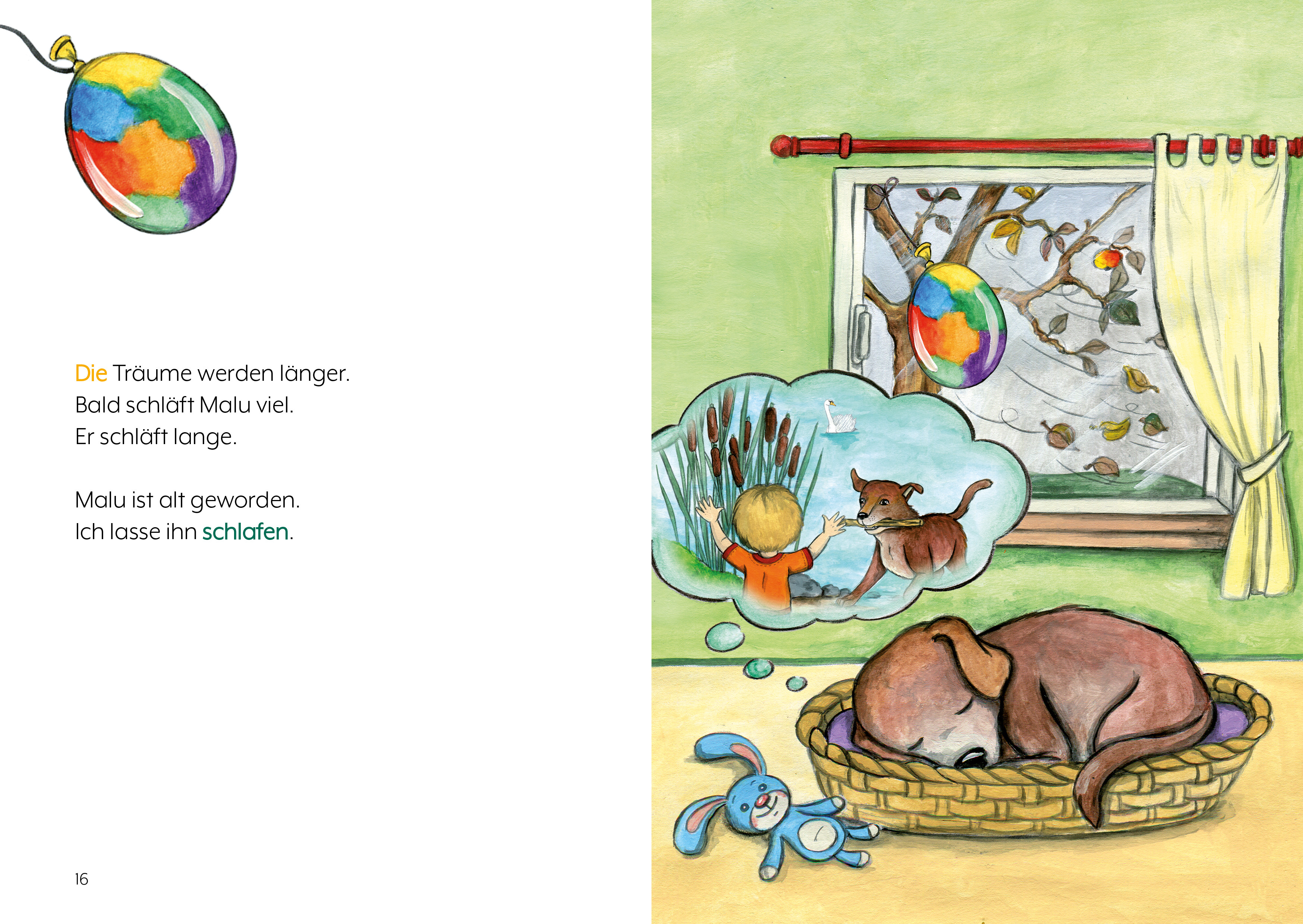 Eine Antwort auf diese Fragen versucht die Sonderpädagogin Christina Grünig zu geben. In ihrem Buch ist es der Hund Malu, der stirbt und einen kleinen Jungen traurig und verzweifelt zurücklässt. Doch durch die Erinnerung an gemeinsame Erlebnisse und die Erkenntniss, dass ihre Freundschaft etwas ganz Besonderes war, schafft es der Junge, Malu loszulassen. Sinnbild dafür ist ein Luftballon, der den Jungen und seinen geliebten Hund das ganze Buch hinweg begleitet und zu guter Letzt in den Himmel aufsteigt.