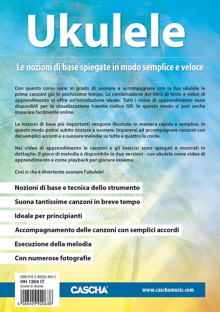 Con questo corso sarai in grado di suonare e accompagnare con la tua ukulele le prime canzoni già in pochissimo tempo. La combinazione del libro di testo e video di apprendimento vi offre un‘introduzione ideale. Tutti i video di apprendimento sono disponibili per la visualizzazione tramite codice QR. In questo modo si può anche imparare facilmente online.