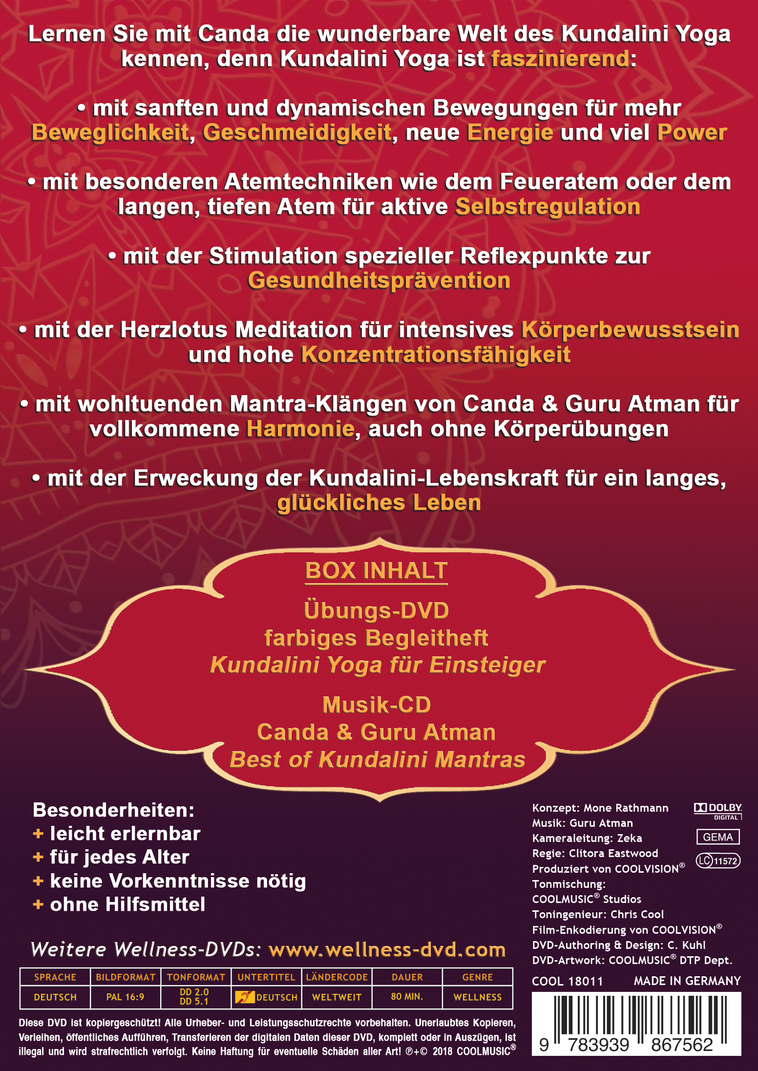 Die Box beinhaltet die Anfänger-DVD "Kundalini Yoga für Einsteiger" und das begleitende farbige Übungsheft sowie die Musik-CD "Best of Kundalini Mantras" von Canda & Guru Atman.Programm-Features:? extra Infoteil? Option Kurzprogramme? Programme mit oder ohne Anleitung wählbar? in Dolby Digital 2.0 Stereo oder 5.1 Surround SoundBesonderheiten:+ leicht erlernbar+ für jedes Alter+ keine Vorkenntnisse nötig+ ohne Hilfsmittel