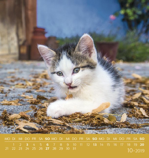 Aufstellbarer Postkartenkalender mit bezaubernden Fotos von eleganten Stubentigern und rührend niedlichen Kätzchen.