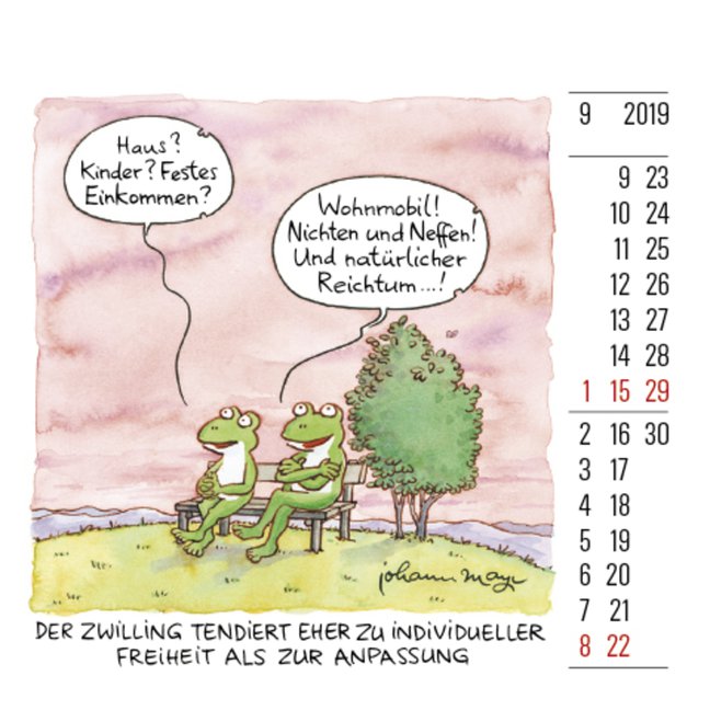 Der erfolgreiche Sternzeichenkalender mit charmanten und witzigen Cartoons von Johann Mayr im Mini-Format.