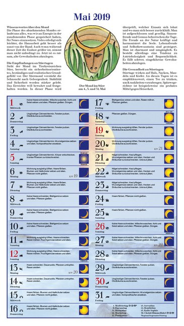 Großformatiger Mondkalender für die praktische Tagesplanung im Zeichen des Mondes. Mit ausführlichen Zusatzinformationen zu Wissenswertem, Empfindungen und Gesundheit in den einzelnen Tierkreiszeichen.
