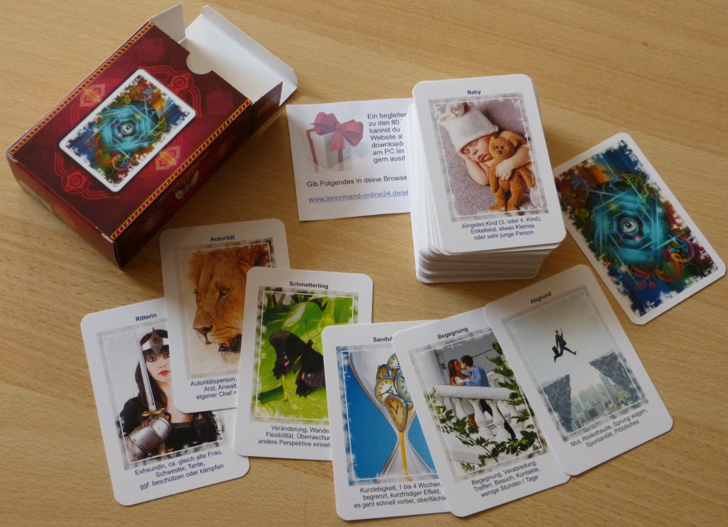 Es ist jedoch kein übliches Lenormand Kartendeck und auch kein klassiches Tarot Kartendeck. Es handelt sich um ein eigenständiges Kartendeck mit 80 Wahrsagekarten, die lediglich mit einigen Motiven ans Lenormand oder Tarot erinnern.